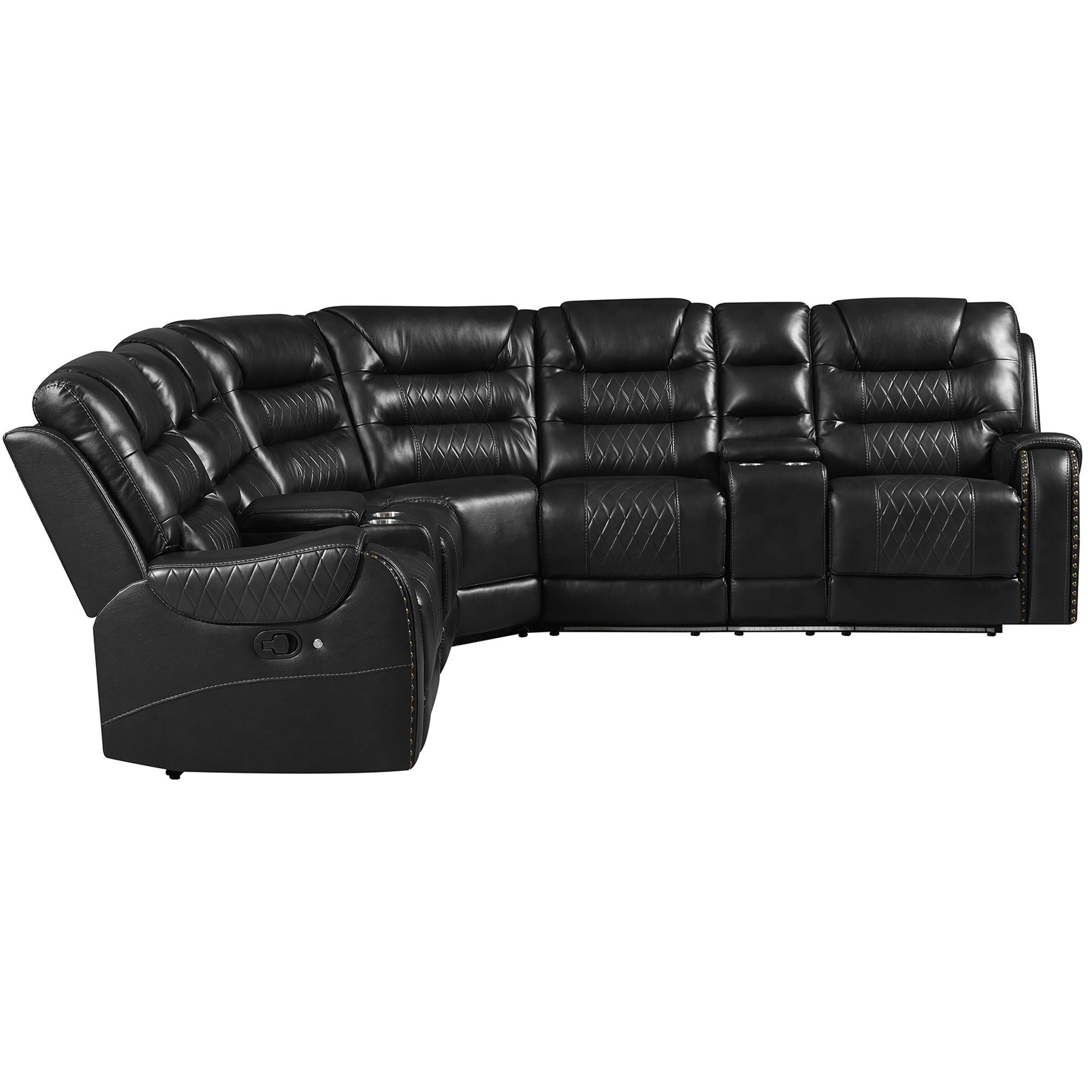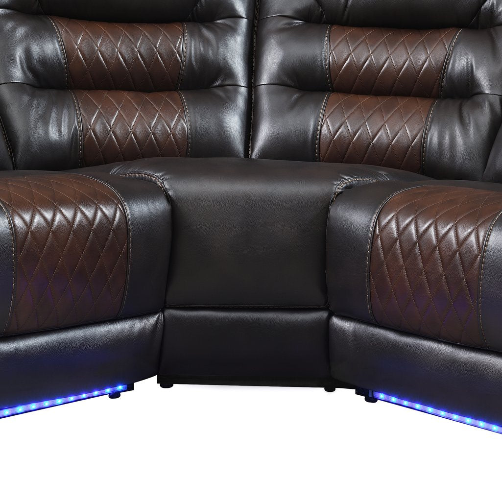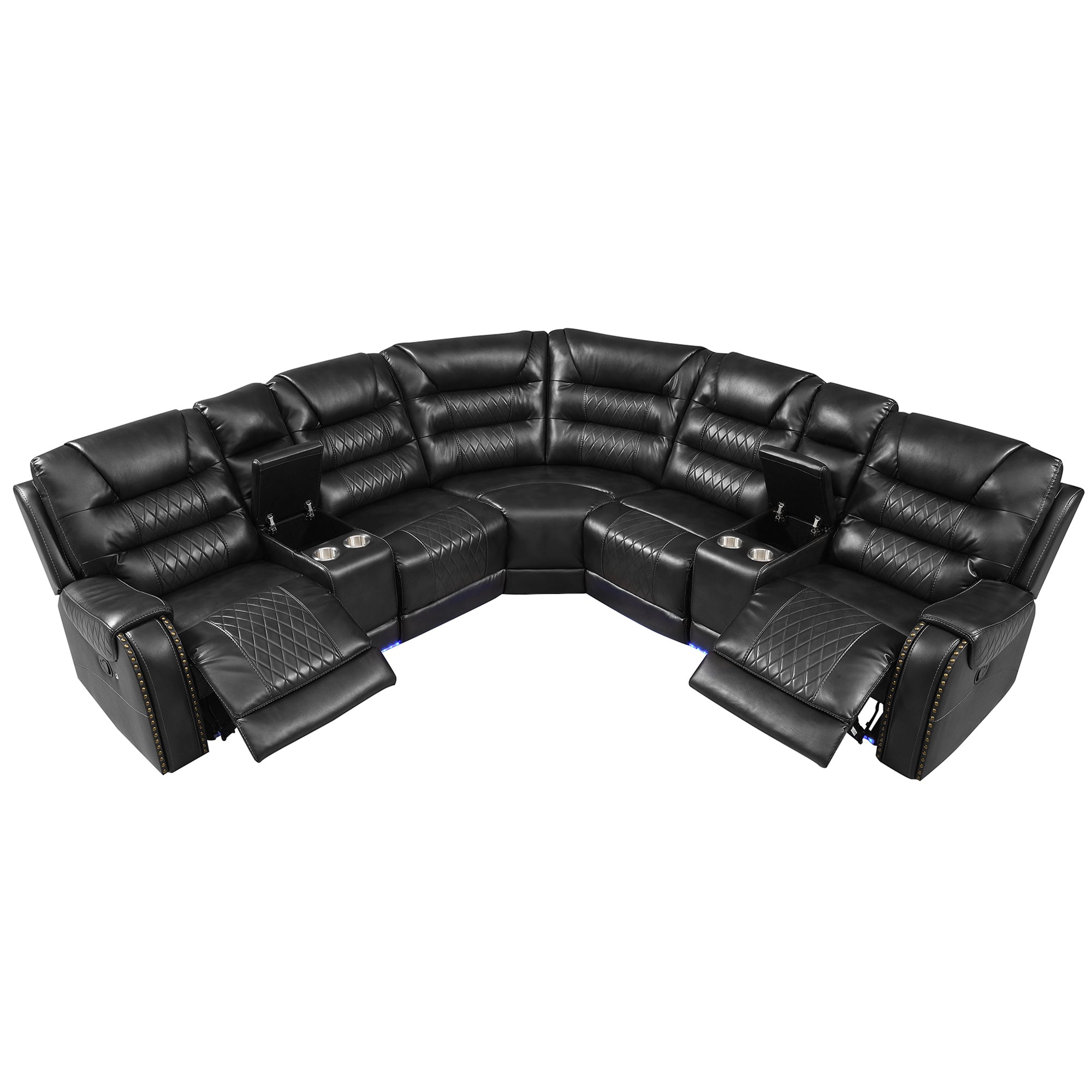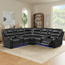 Give your living room an upgrade with this spacious, manual reclining sectional designed for comfort, convenience, and contemporary style. Built with durable PU leather upholstery, a sturdy iron and plywood frame, and metal legs, this L-shaped symmetrical sectional offers multiple recline positions, integrated storage, cup holders, and LED accent lighting—making it ideal for family rooms, home theaters, and large gathering spaces.