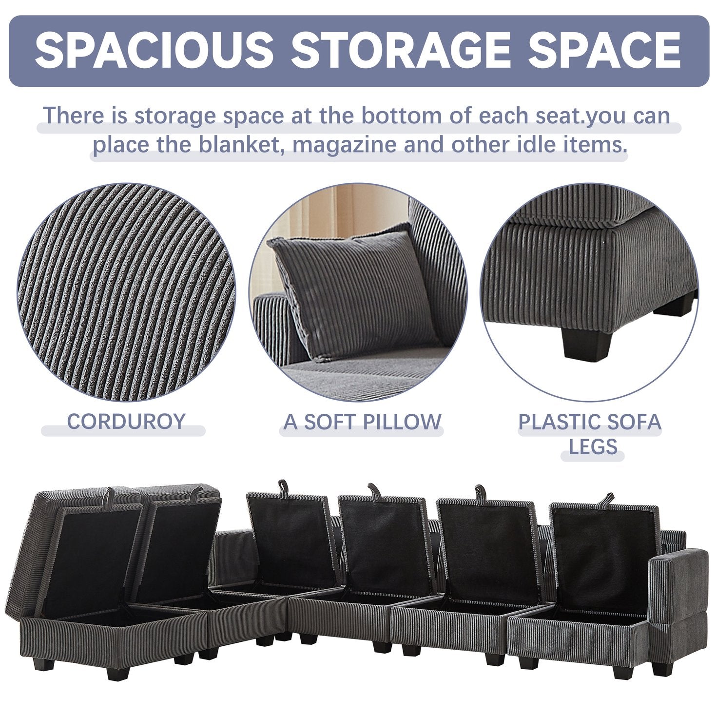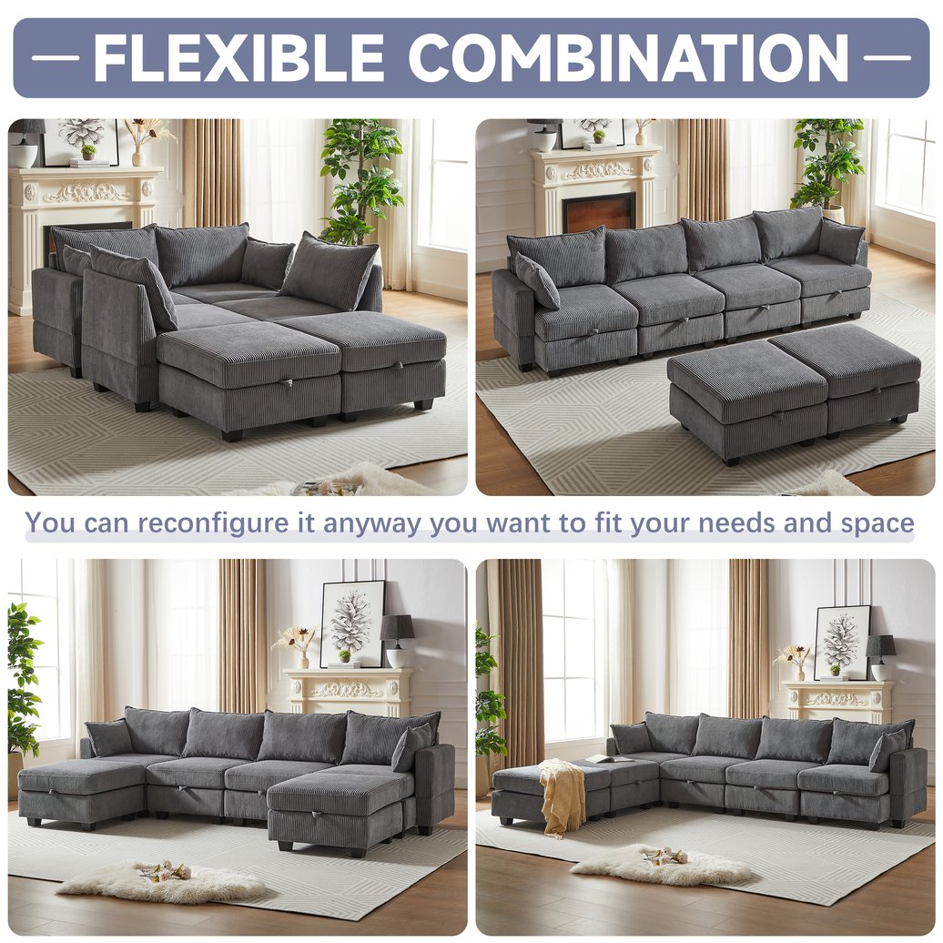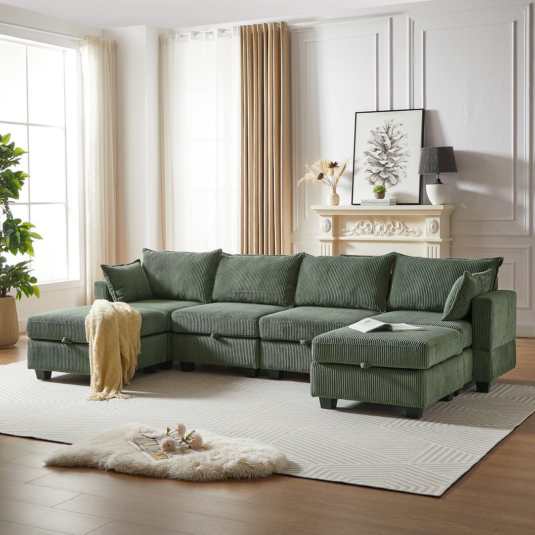 Refresh your living area with a versatile, comfortable modular sectional designed for modern living. This plush corduroy U-shaped sofa adapts to your needs—arrange it as an L or U shape, convert it into a sleeper for overnight guests, and keep clutter out of sight with generous under-seat storage. Stylish, practical, and family-ready, it accommodates gatherings, lounging, and everyday life with ease.