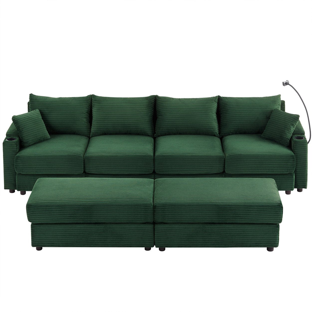 Create a comfortable, functional centerpiece for your living room with this modern modular 4-seater sectional. Designed for everyday living, it combines versatile seating, generous hidden storage, and integrated convenience features—two USB ports, cup holders and a phone holder—wrapped in soft pinwale corduroy for a contemporary yet cozy look. The modular design and movable ottomans let you adapt the layout to your space, while durable construction and pocket-spring seating provide lasting support.