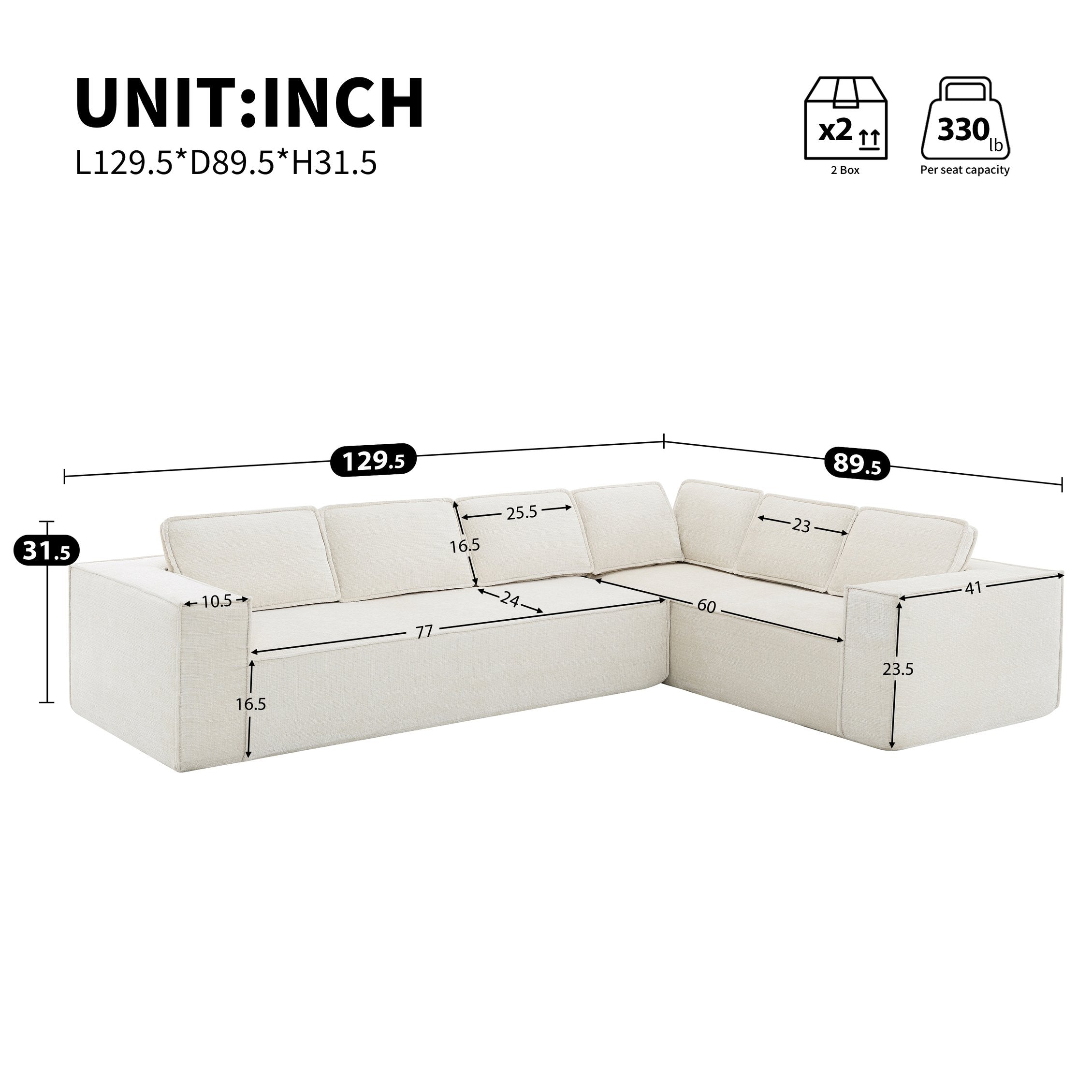 - Key dimensions: Overall 129.5" L x 89.5" W x 16.5" H (Back height from seat to top: 16.5"); Arm height: 23.5"; Seat height: 16.5". (Also listed: 45.67" L x 19.69" W x 18.9" H for certain components—please refer to product label for exact packaged/bench-made measurements.)