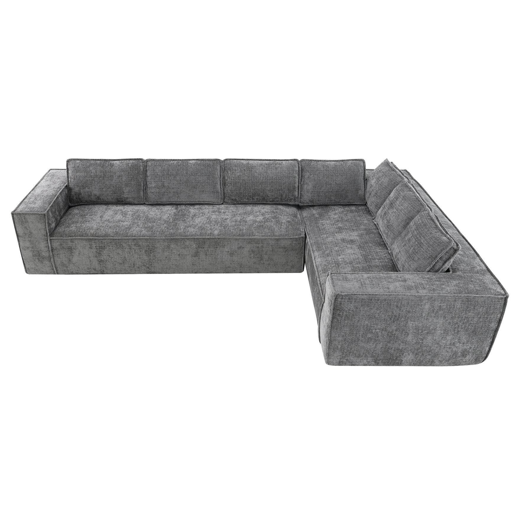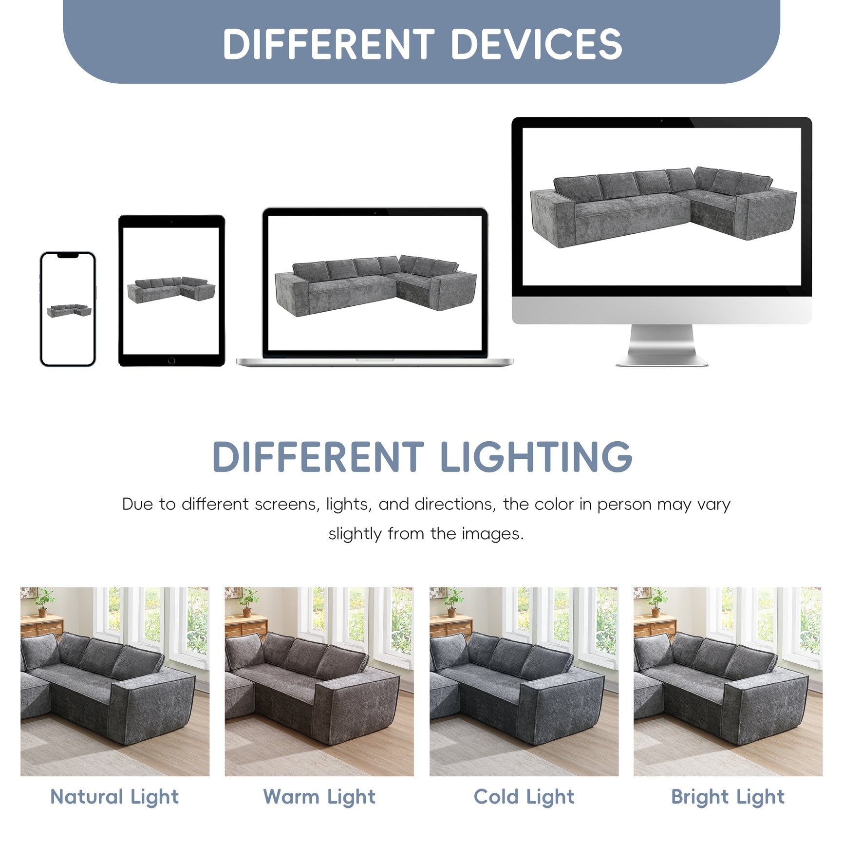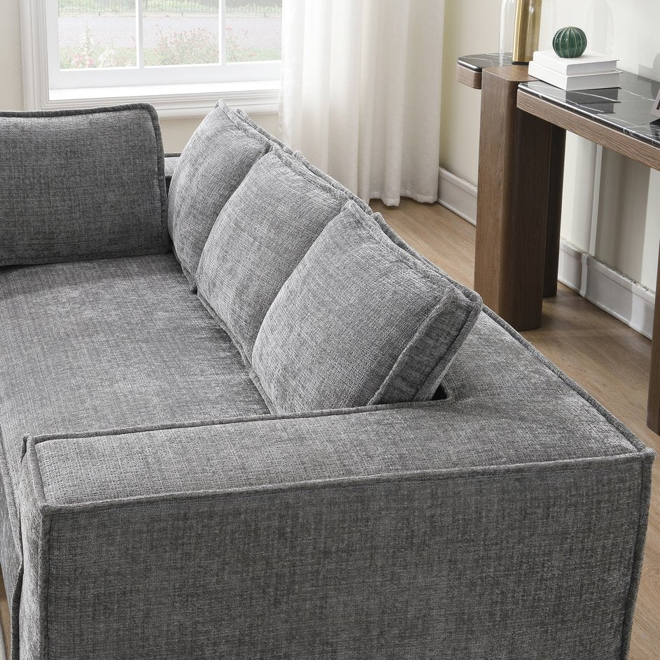 Bring modern comfort and flexible seating to your living space with this minimalist modular sectional. Upholstered in ultra-thick, wrinkle-resistant chenille, the sofa delivers a plush, durable surface that resists creasing while remaining easy to move and reconfigure. Its no-wood-frame, full-compression construction reduces weight and eliminates assembly, making setup effortless and ideal for frequent rearranging or smaller living areas. Clean lines, removable back cushions, and foam-plus-pocket-spring seating create a balanced mix of contemporary style and everyday support.