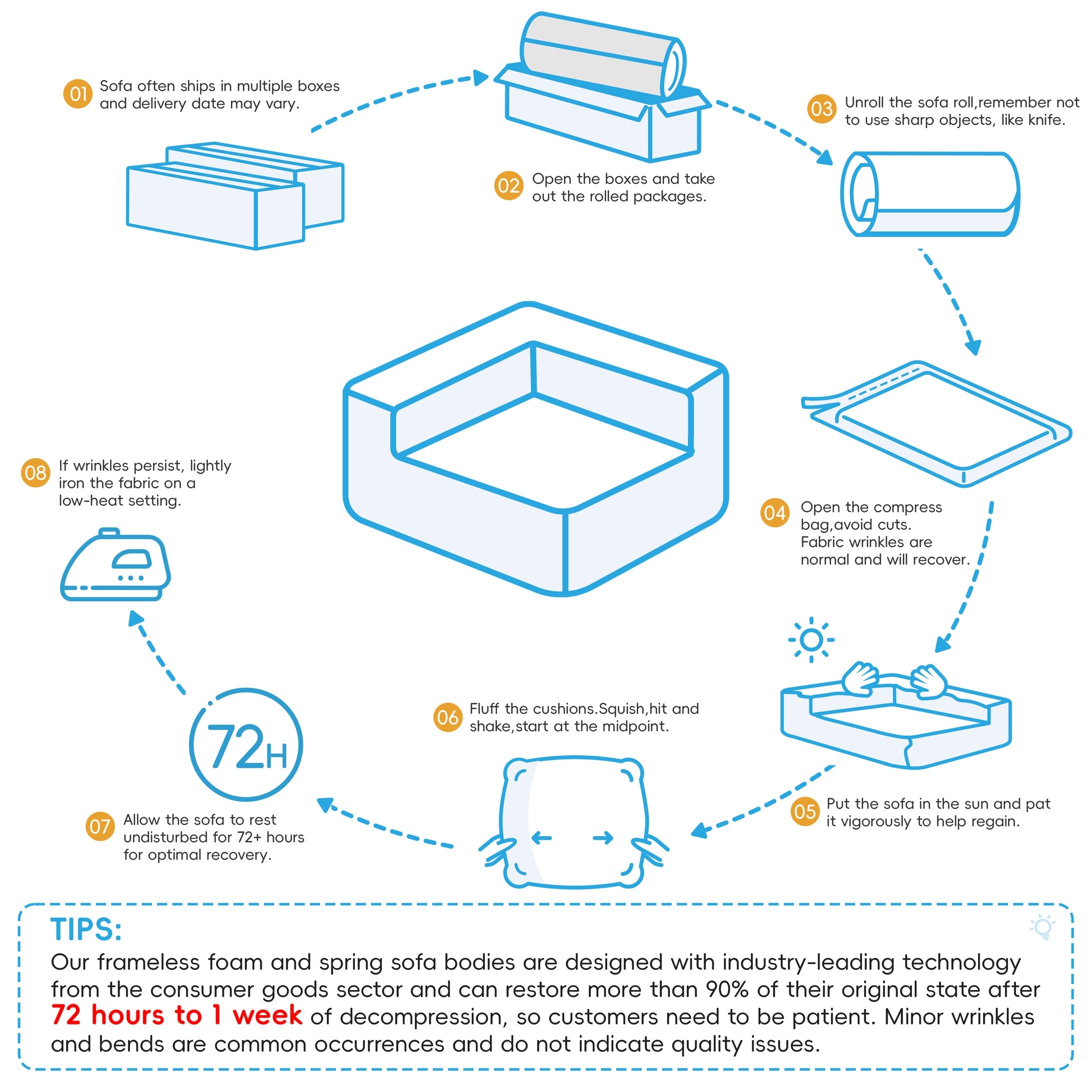 - No Wooden Frame, Full Compression Sofa: This sofa features a unique, no-wood-frame construction with full compression technology. Without a traditional wooden frame, it’s lighter, more flexible, and easier to transport. The full compression design allows for compact packaging, which is particularly convenient for shipping and moving. It still provides the necessary structural integrity to ensure long-lasting support and comfort.Easy to Move: The sofa is moved individually so they are great to na