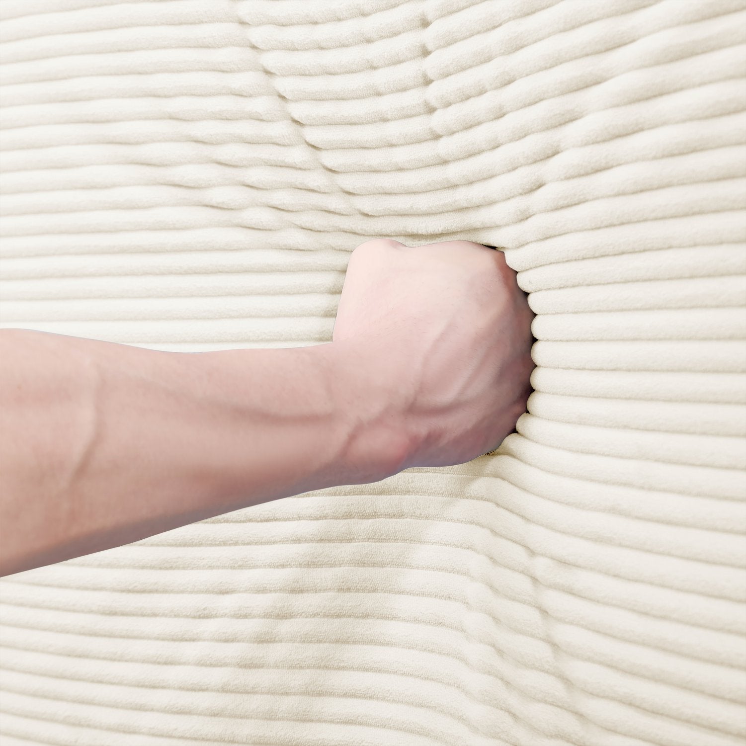 - Upholstery & Finish: High-density corduroy fabric in cream provides a soft, velvety touch with year-round comfort and a refined, casual look.