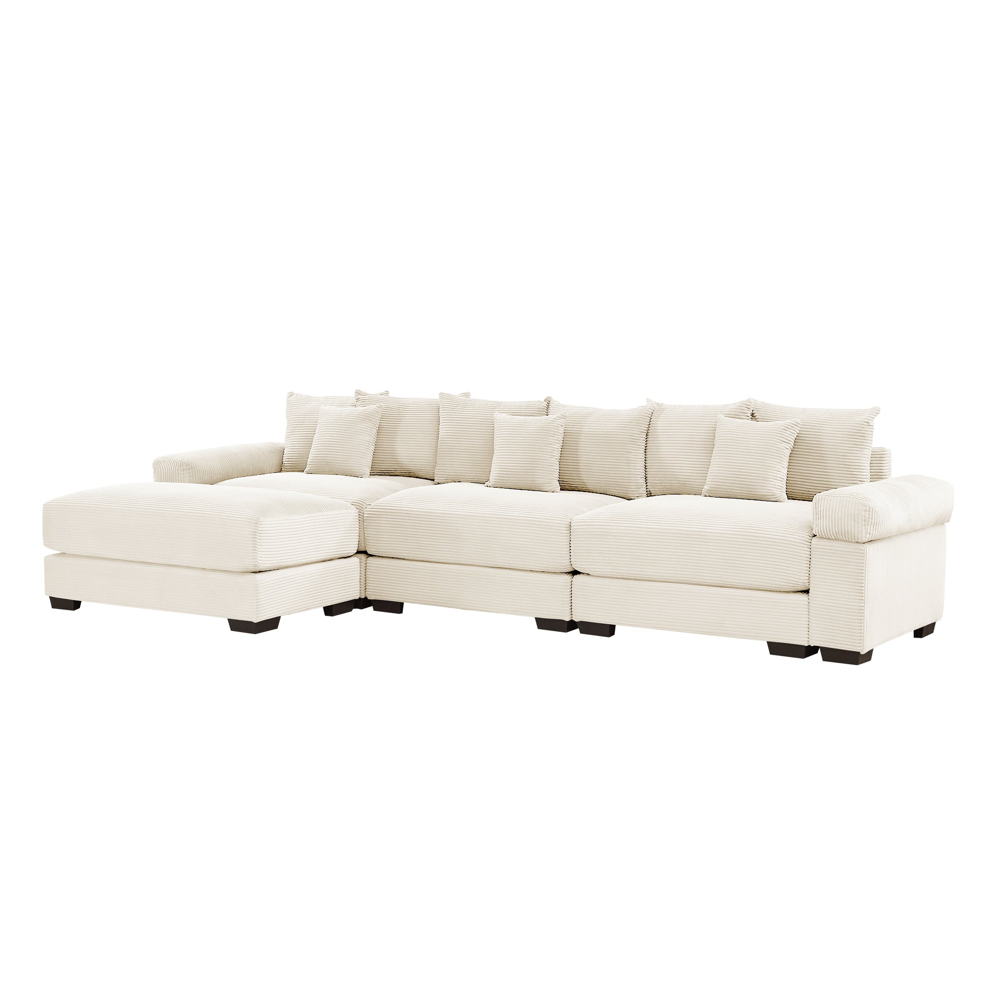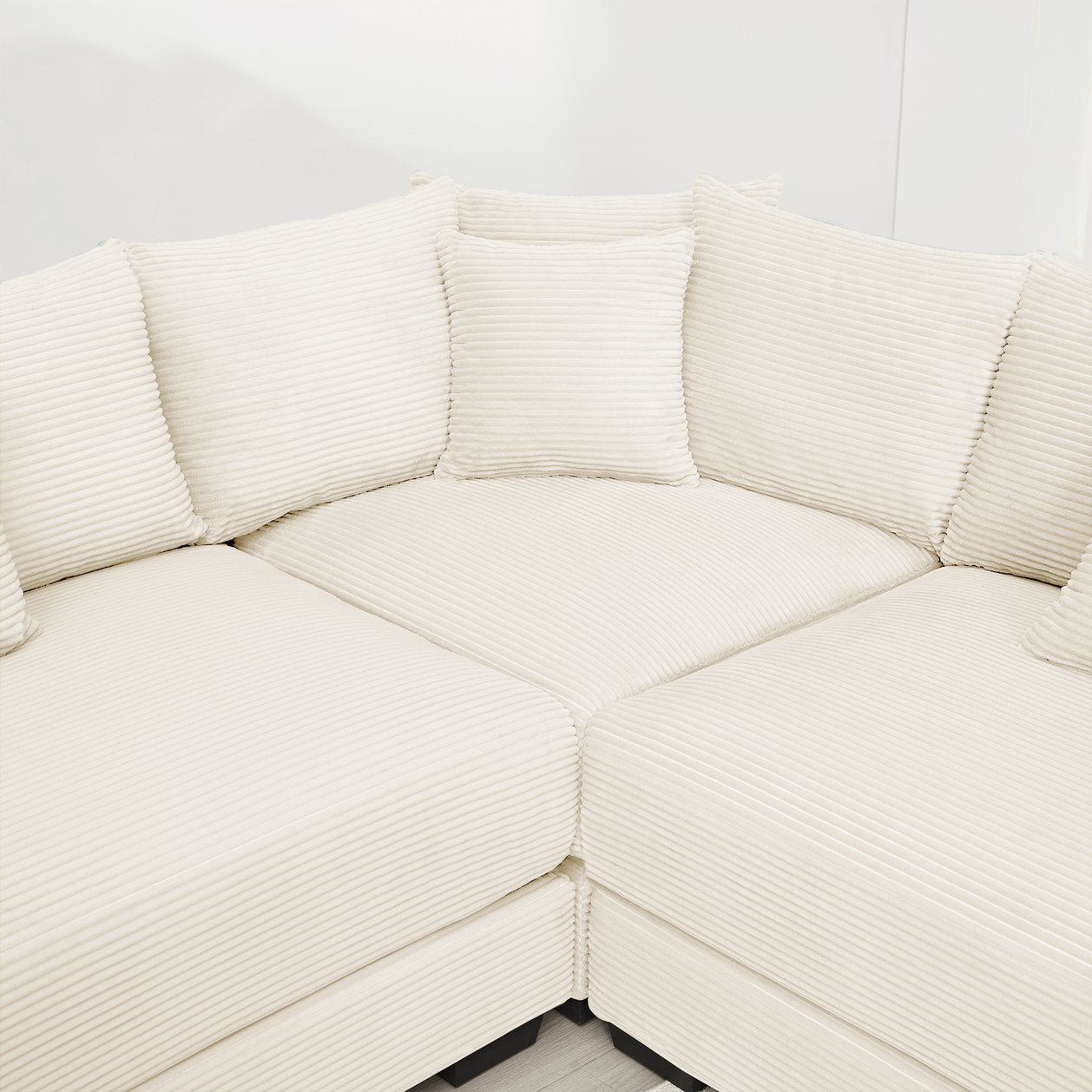 Transform your living space into a cozy, contemporary retreat with this oversized modular L-shape sectional. Upholstered in soft corduroy fabric and built with a solid wood frame, it combines luxurious texture, deep seating, and flexible layout options to accommodate lounging, entertaining, or relaxing with family. The included ottoman and nine pillows let you customize comfort and arrangement, while ergonomic details—like wide armrests and a contoured backrest—support long hours of use without sacrificing style.