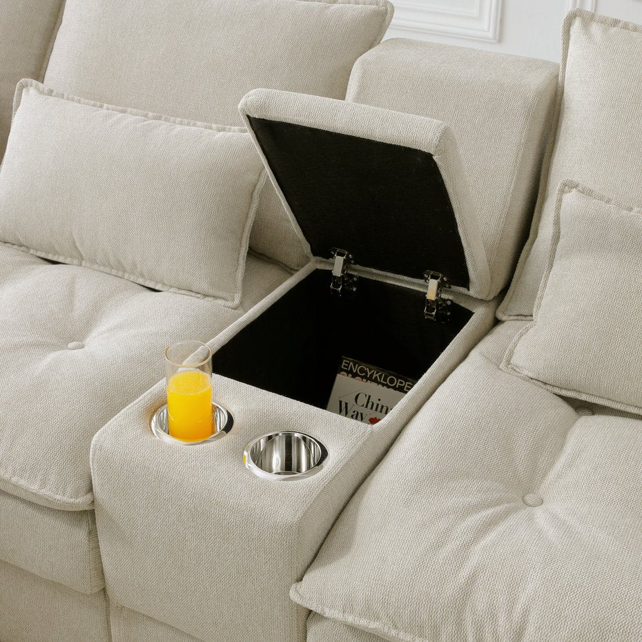 Sink into roomy, modern comfort with this 130" U-shaped sectional designed for everyday living and entertaining. Thoughtfully crafted for apartments and family rooms alike, it combines supportive seating, practical conveniences like a built-in console and cupholders, and durable construction wrapped in soft linen-like upholstery. Ideal for movie nights, gatherings, or napping, this sectional delivers style and function in one cohesive package.
