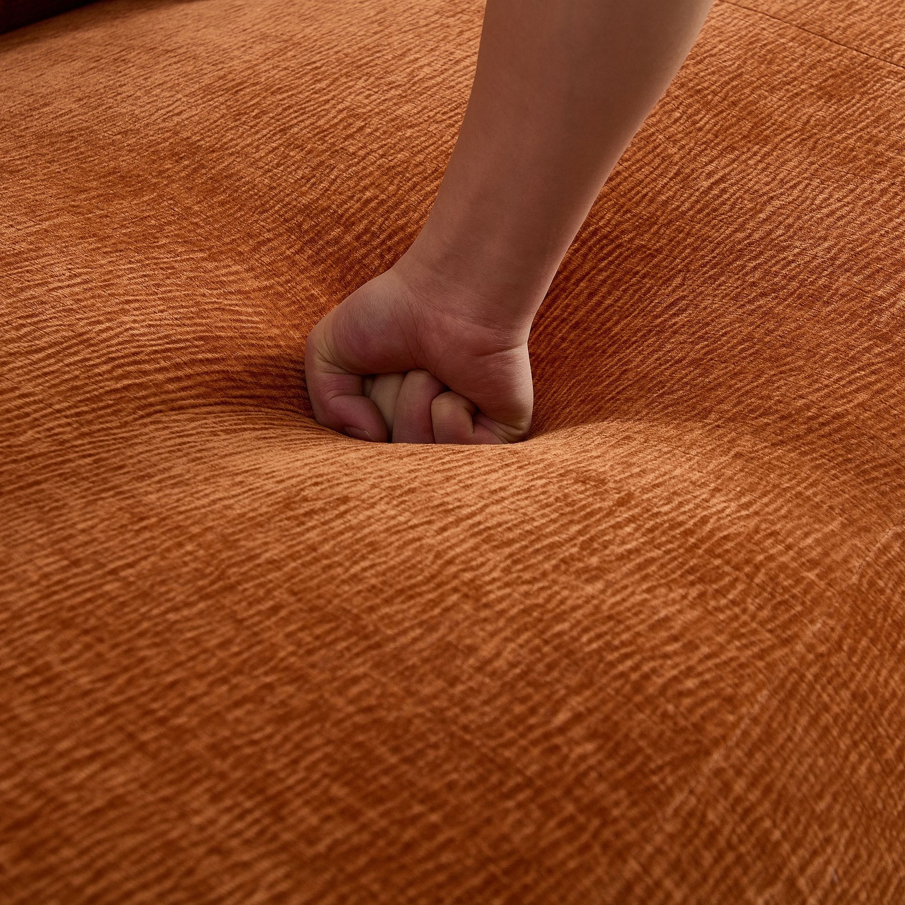 Elevate your living space with this oversized L-shape sectional designed for modern comfort and effortless style. Upholstered in warm orange fabric with a contrasting PU leather base, the sectional combines plush seating, a graceful curved profile, and generous proportions to accommodate family gatherings, movie nights, or relaxed lounging in a contemporary home.