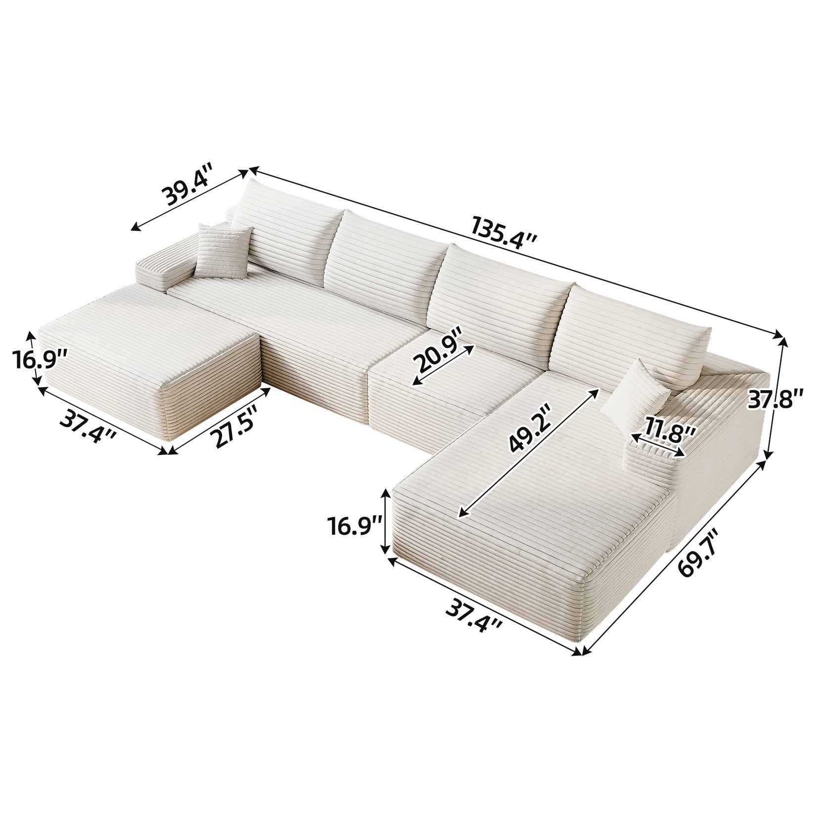 Sink into expansive, cloud-like comfort with this modern, minimalist U-shaped sectional designed for effortless living. Upholstered in plush corduroy fabric, the sofa provides a soft, tactile surface and deep seating that invites lounging, entertaining, or simply relaxing. With a modular layout and no assembly required, this sectional arrives ready to enhance your living room, apartment, or bedroom with a contemporary yet timeless silhouette.