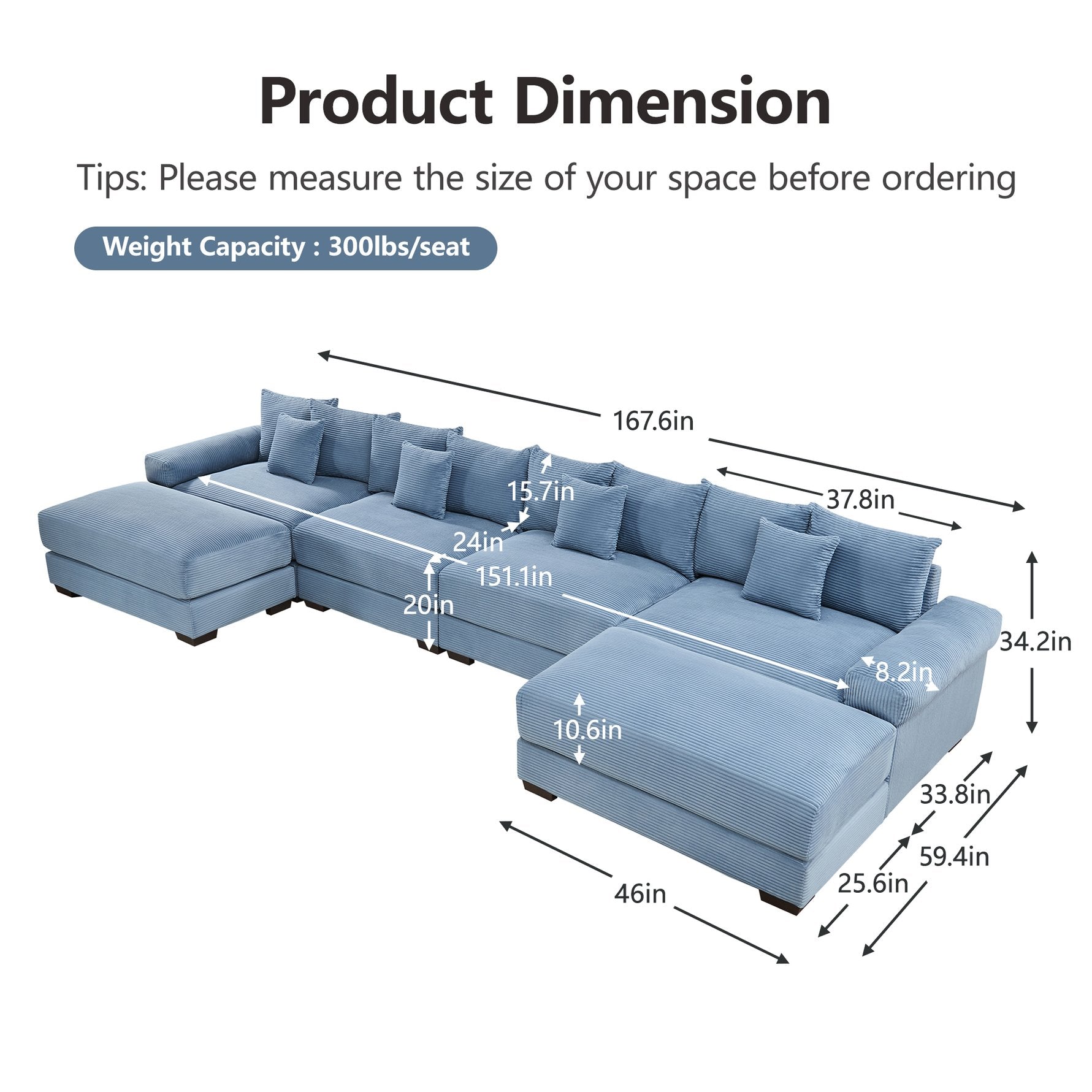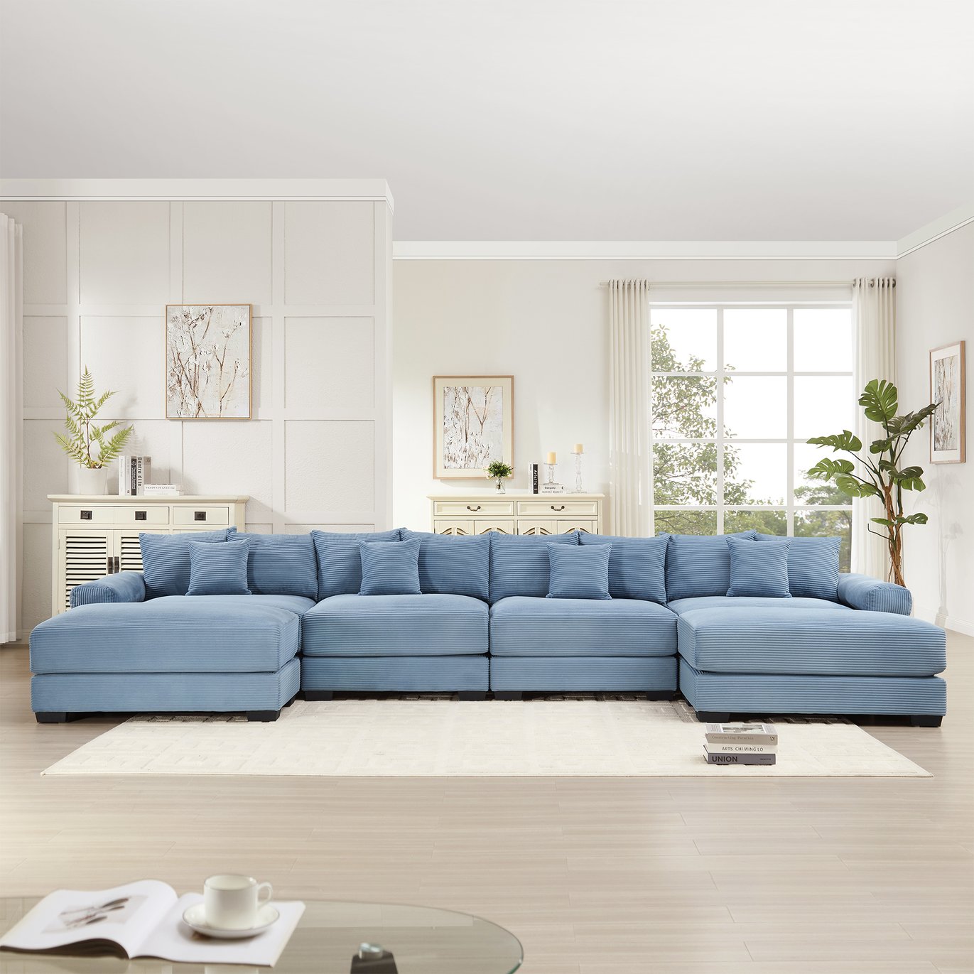 Create a cozy, contemporary centerpiece for your living space with this oversized modular U-shape sectional. Upholstered in plush high-density corduroy, it combines deep seating, supportive wide armrests, and a flexible modular layout to suit large family rooms, open-plan areas, or media lounges. The included ottoman and eight throw pillows let you customize comfort and arrangement while durable construction ensures lasting use.