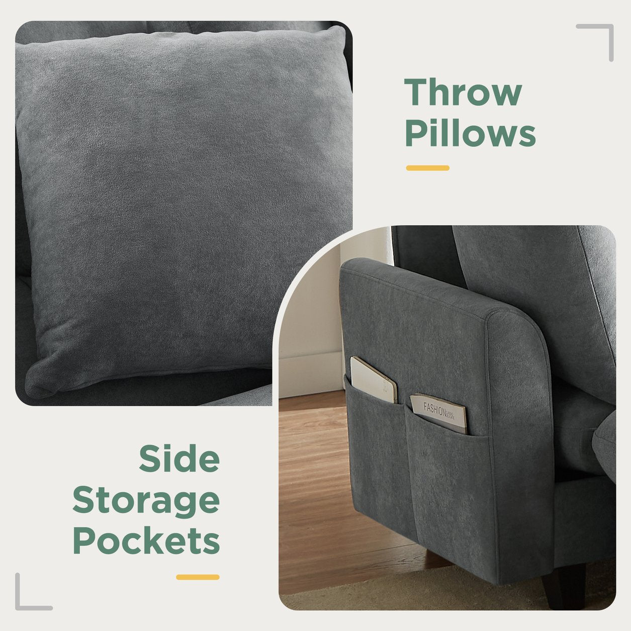 - Convenient Side Storage Pockets - The sides of the sofa feature built-in storage pockets, which are perfect for stashing remote controls, reading materials, or your phone. These accessible compartments keep everyday essentials within easy reach while maintaining a clean, organized living room.