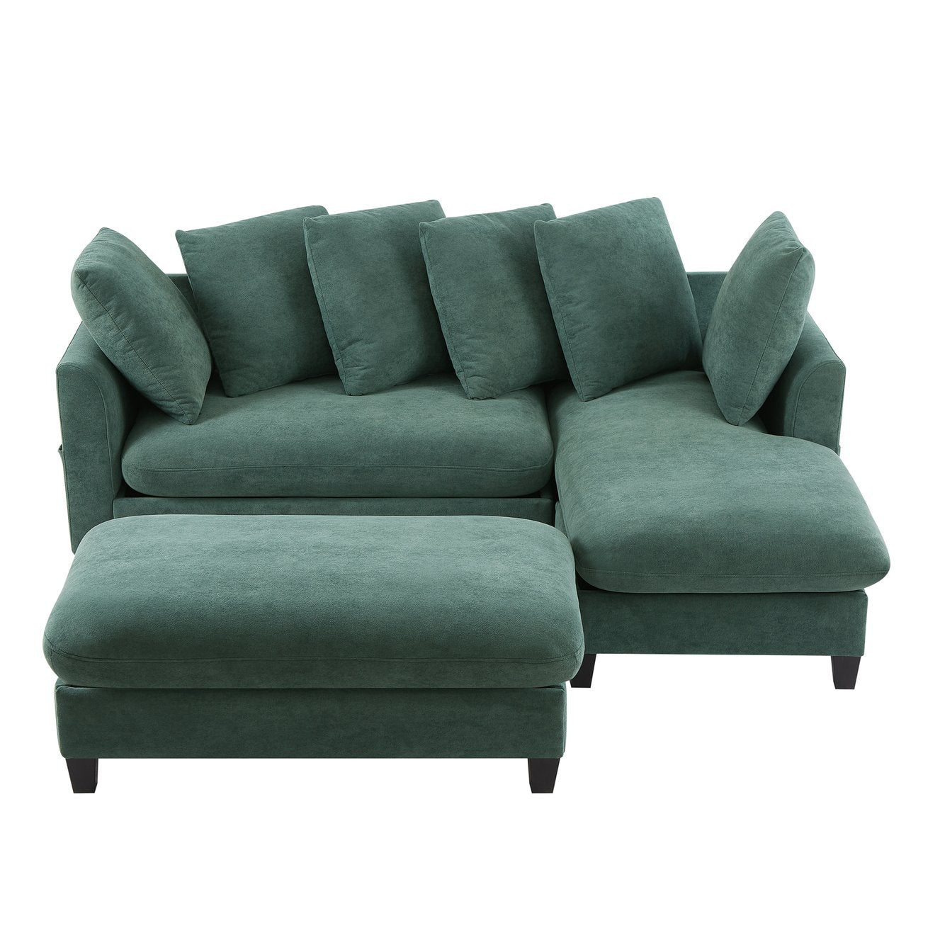 This versatile 83" L-shaped sectional blends modern style with practical features to suit everyday living. Upholstered in soft, durable green chenille, it offers comfortable seating, generous hidden storage, and a movable ottoman that converts into a bed or functions as a footrest or coffee table. Thoughtful details such as side storage pockets, ergonomically curved armrests, and six matching throw pillows make this sectional both stylish and highly functional for living rooms, family rooms, or multi-purpose spaces.