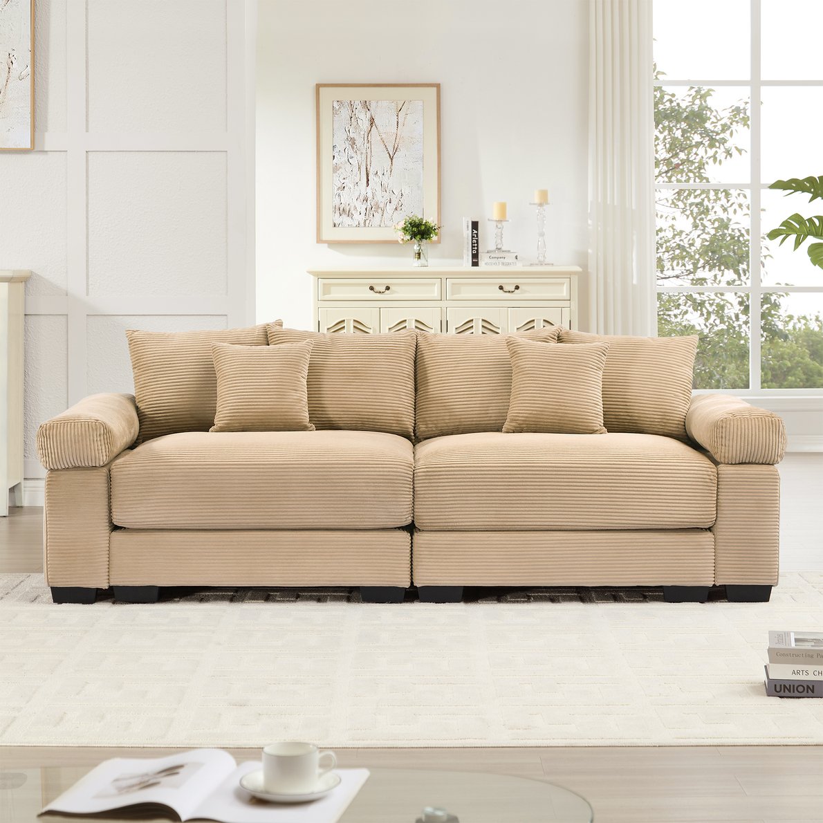 - Premium Material Craftsmanship:Upholstered in soft, high-density corduroy fabric, the sofa offers a smooth and delicate touch. Its unique velvety texture creates a luxurious seating feel suitable for year-round use. The durable and wear-resistant fabric, combined with high-quality sponge seat cushions and a solid wood frame, ensures long-lasting comfort and reliability through stable support.