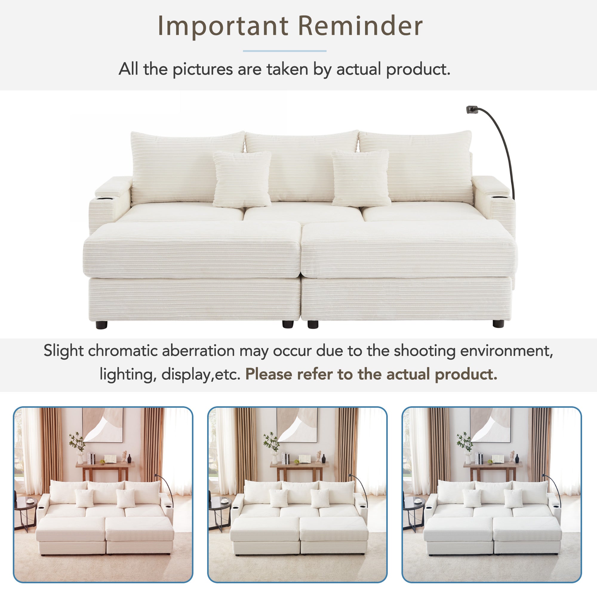 This modern modular 3-seater sectional sofa blends practical storage and tech-friendly features with comfortable, contemporary styling. Designed for flexible living spaces, it includes two movable ottomans, hidden armrest storage, built-in cup holders, USB charging ports and a phone holder — all wrapped in durable pinwale corduroy upholstery. Ideal for living rooms, home offices or reception areas, the set is easy to configure and maintain while offering supportive seating for everyday use.