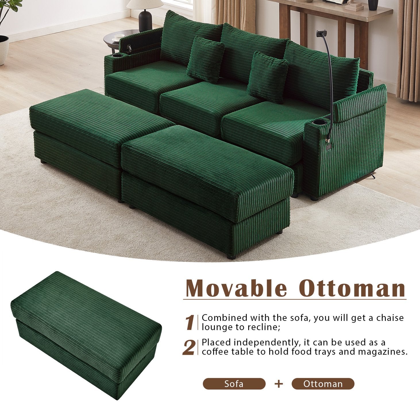 Bring modern comfort and smart convenience to your living space with this versatile 3-seater sectional sofa set. Designed for adaptable layouts and everyday living, the sectional pairs durable pinwale corduroy upholstery with thoughtful features — hidden armrest storage, USB charging, cup holders, a phone holder, and two movable ottomans — so you can relax, entertain, or work in style. Its supportive pocket-spring-and-foam seat system and removable cushions make it both comfortable and easy to maintain.