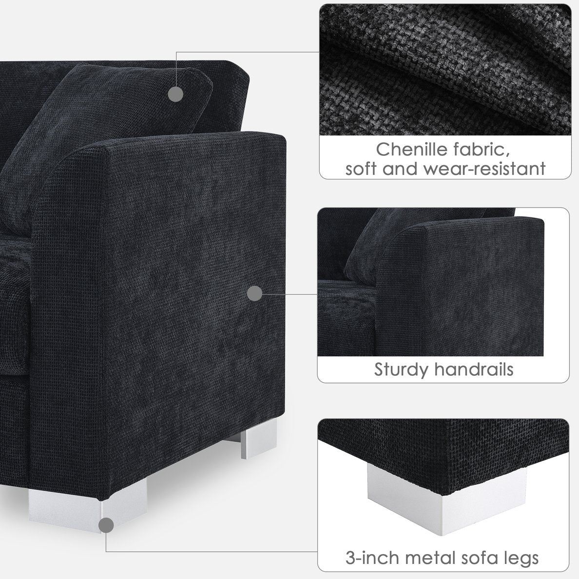 This modern L-shaped sectional blends contemporary style with everyday comfort — an oversized chaise and plush chenille upholstery create a luxurious lounging experience while durable construction and silver aluminum feet deliver a refined, long-lasting centerpiece for living rooms, apartments, or offices. Designed for four-seat seating and easy maintenance, this sectional includes two accent pillows and removable seat and back cushions for flexible care and comfort.