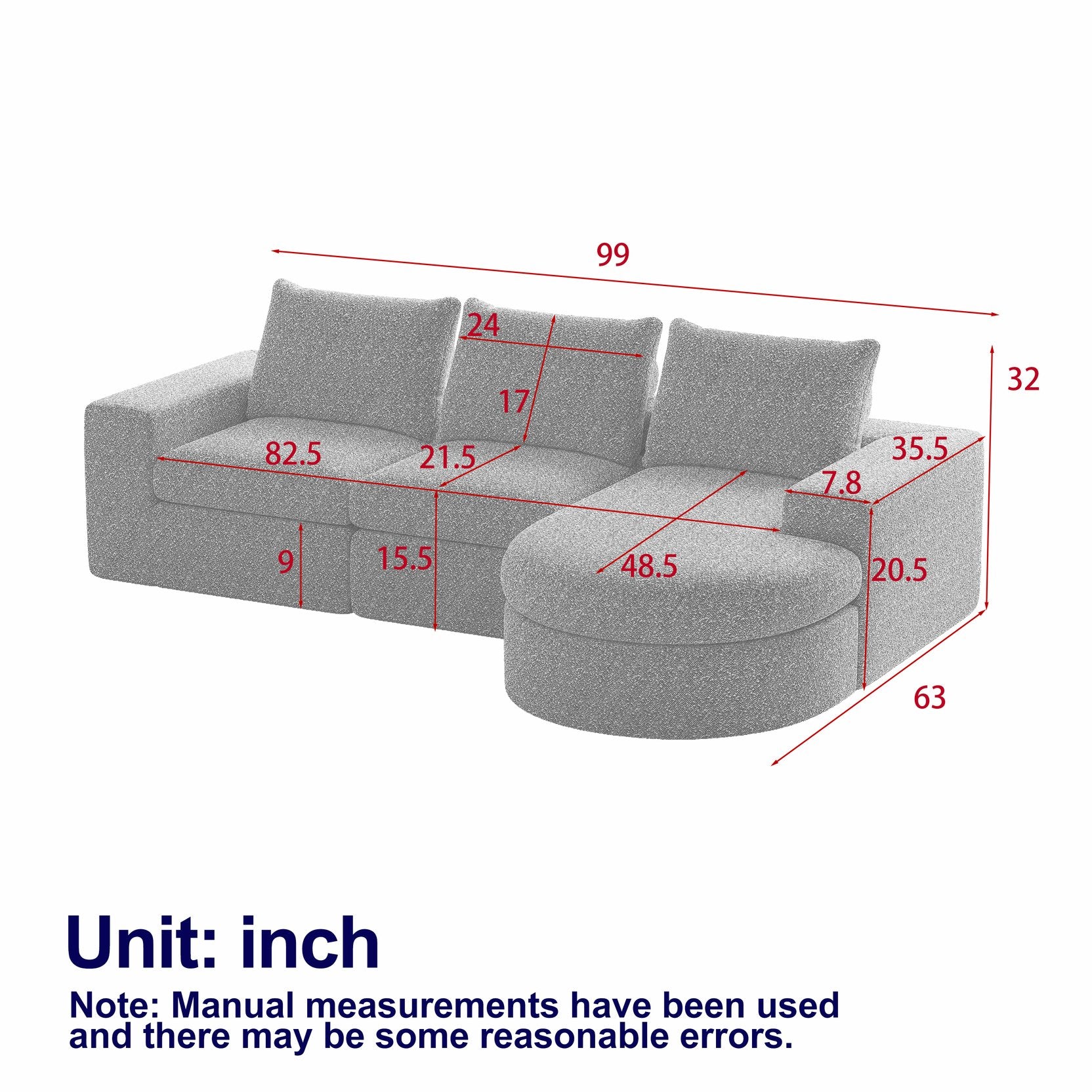 - Overall size: 99-inch sectional; Product dimensions: 44.9 L x 17 W x 17 H (prominent dimensions as provided)