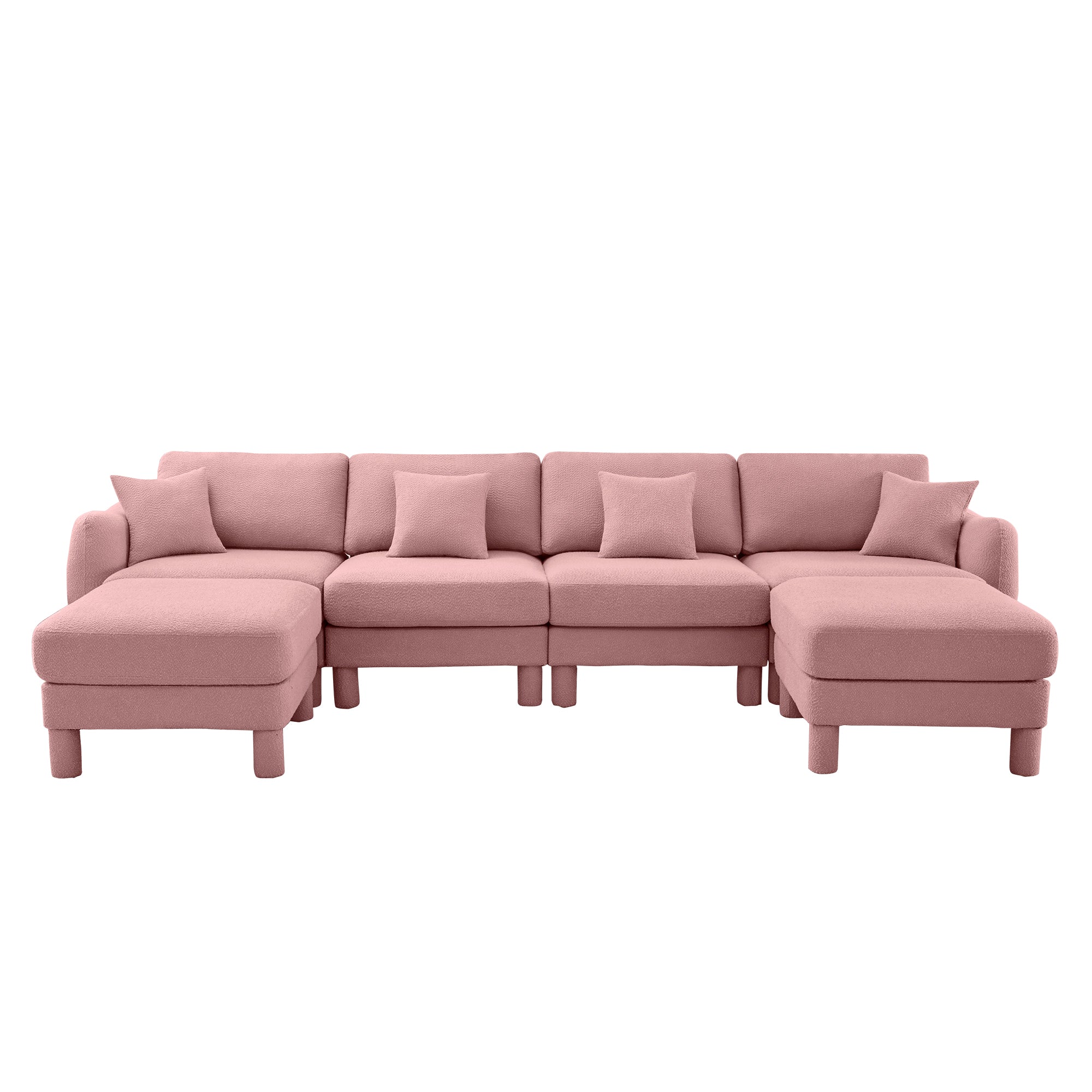 A chic and contemporary centerpiece for modern living spaces, this boucle fabric U-shape sectional combines sculptural style with everyday comfort. Featuring distinctive shell-shaped armrests and two movable ottomans, the sofa offers versatile seating and a soft, inviting texture that elevates lounges, living rooms, bedrooms, or office reception areas. Built for durability and relaxation, it pairs a sturdy wooden frame and spring-coil support with plush foam padding and breathable boucle upholstery for lasting comfort.