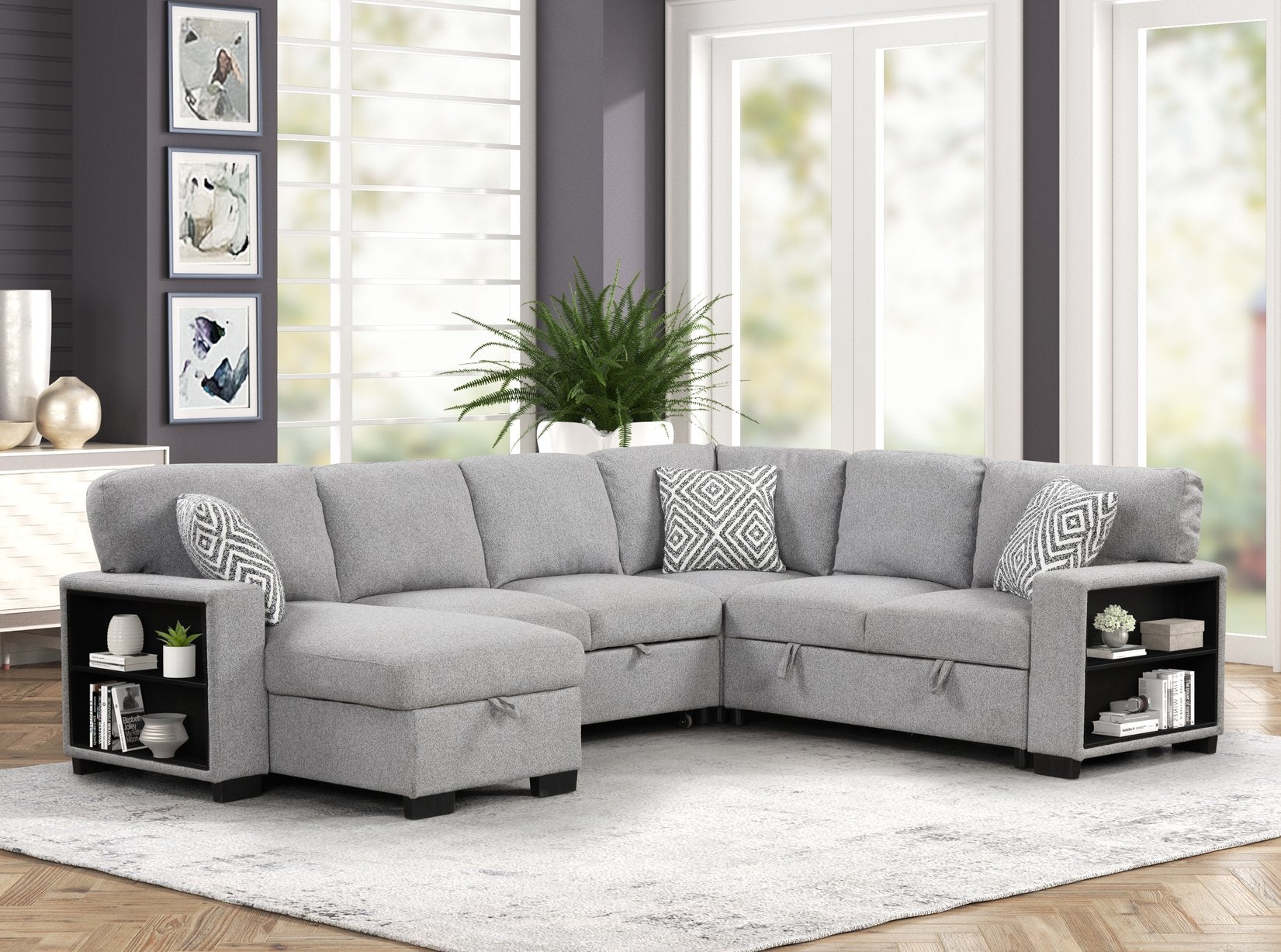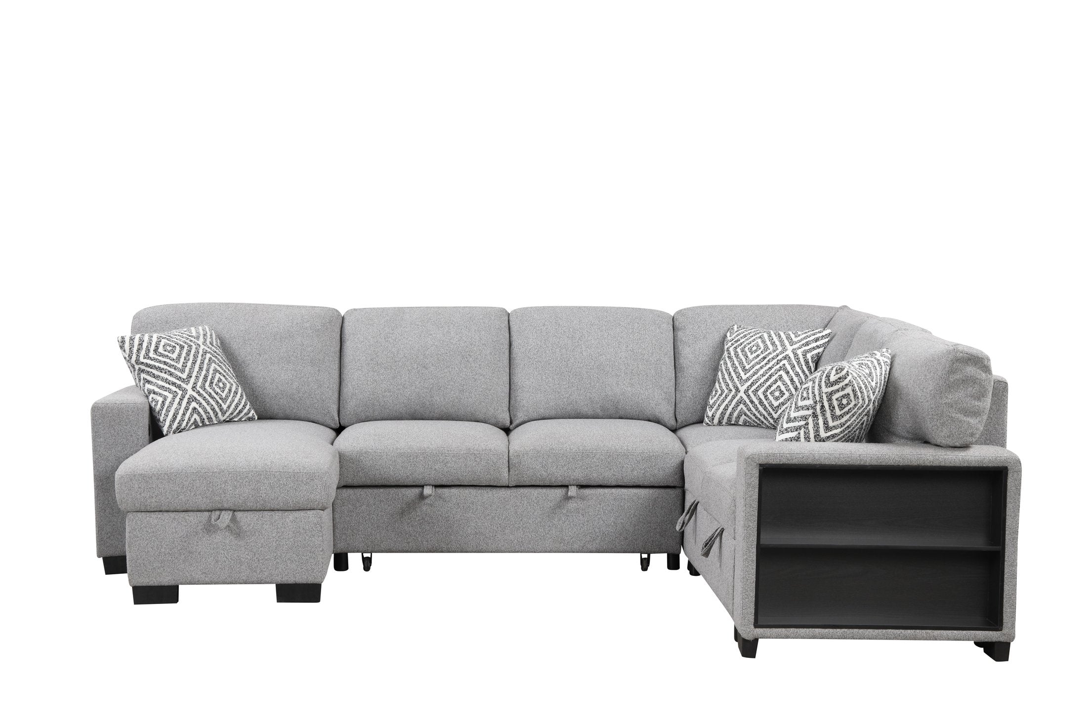 Elevate your living space with this modern, multifunctional sectional designed for comfort, convenience, and contemporary style. Upholstered in durable gray fabric and built with a sturdy wood and metal frame, it combines cozy seating with smart storage and guest-ready features—ideal for everyday living and entertaining.