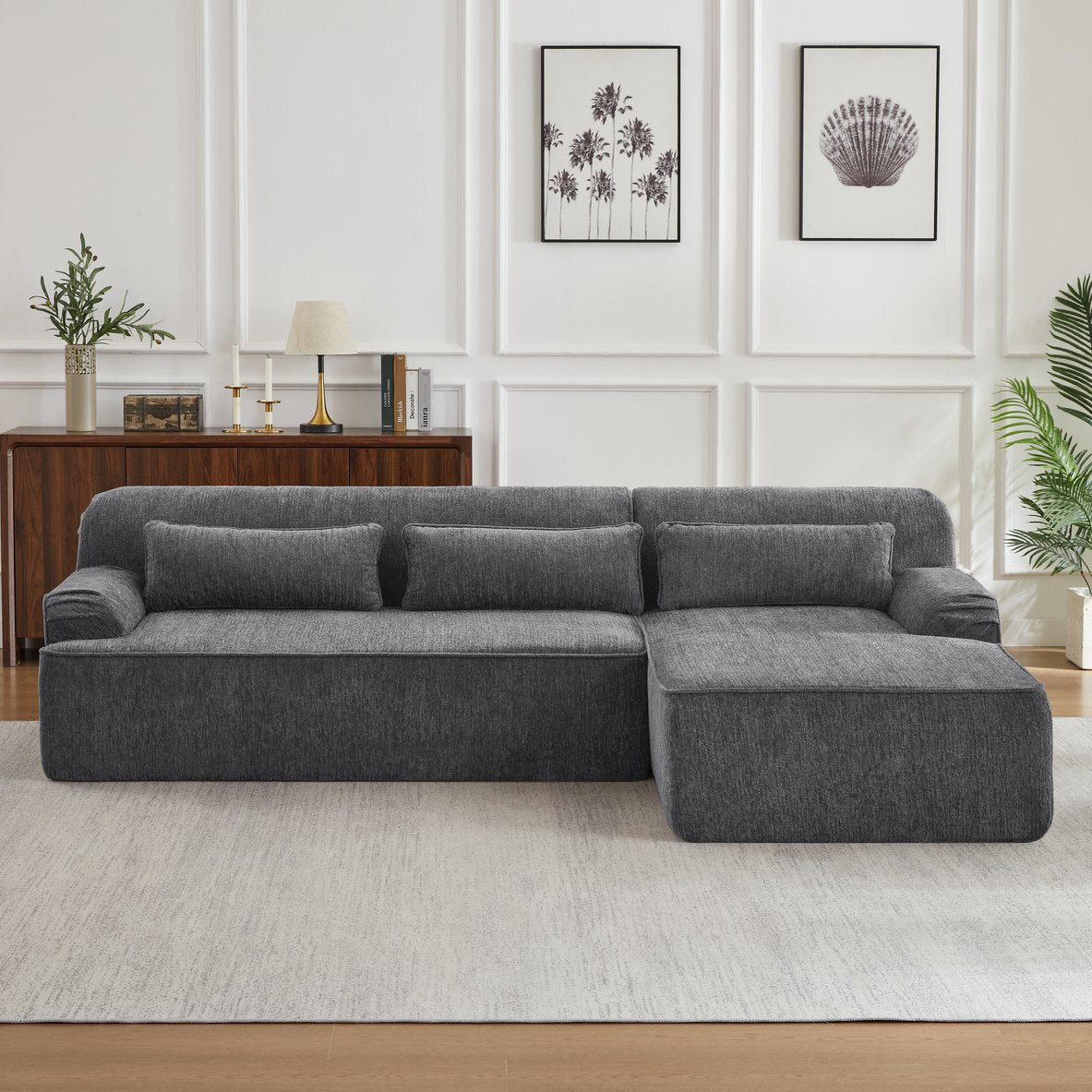 - Material: Crafted from high-quality chenille fabric, this sectional sofa offers a soft and luxurious texture that enhances the comfort and elegance of any living space.