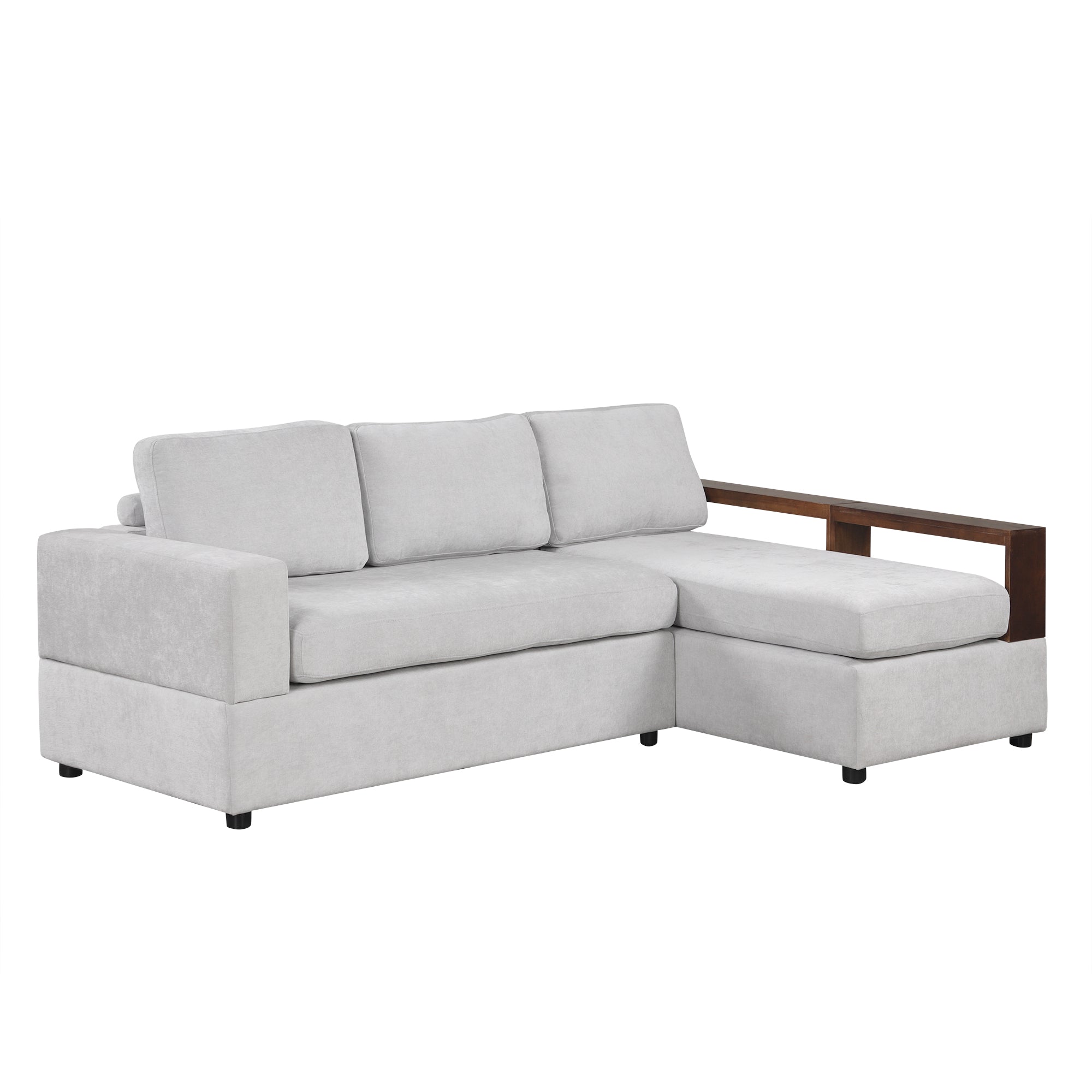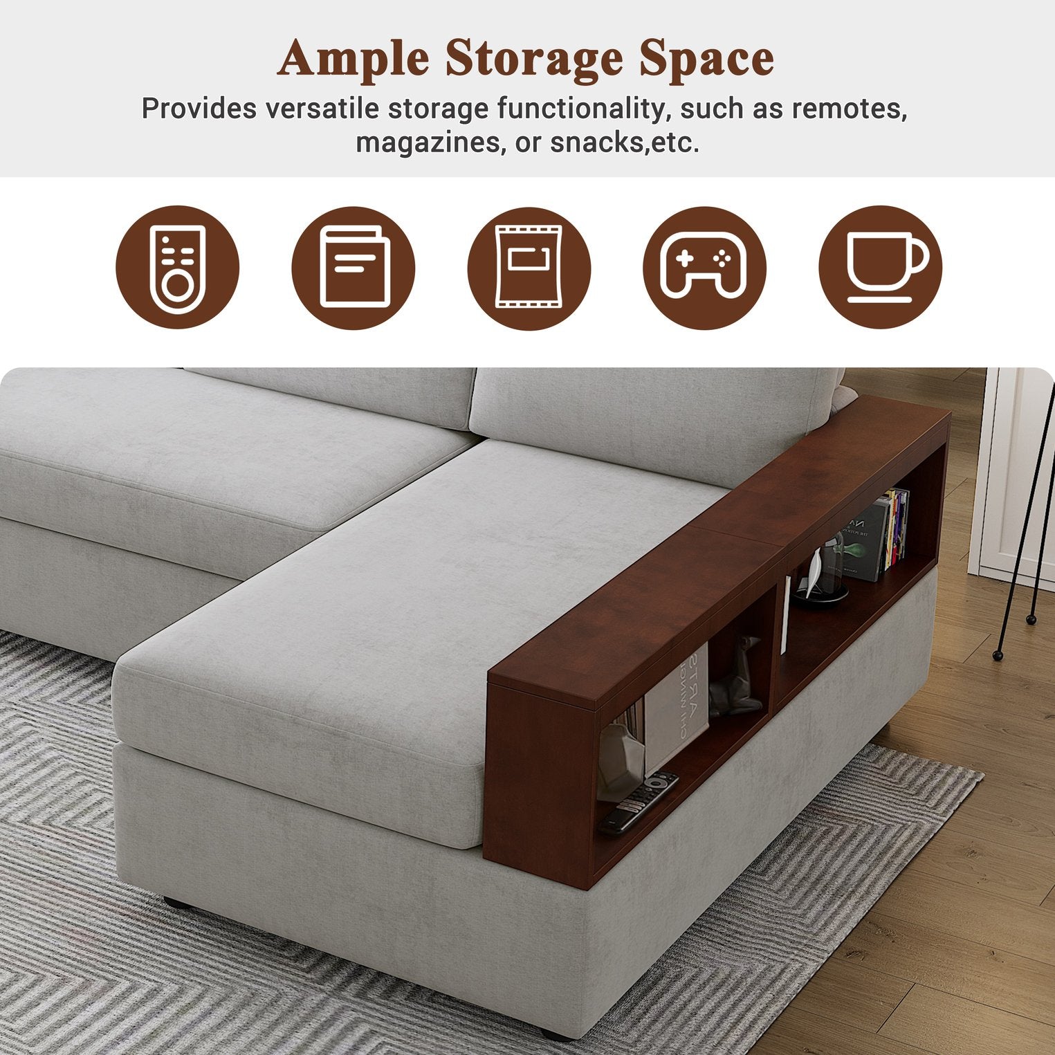 Transform your living space with this stylish and functional L-shaped sectional that blends durable construction, plush comfort, and clever storage. Upholstered in breathable beige chenille, the sofa features high-density foam with pocket springs for supportive seating, an integrated chaise for lounging, and reversible armrests with built-in wood storage racks for added versatility—perfect for everyday family use or entertaining guests.