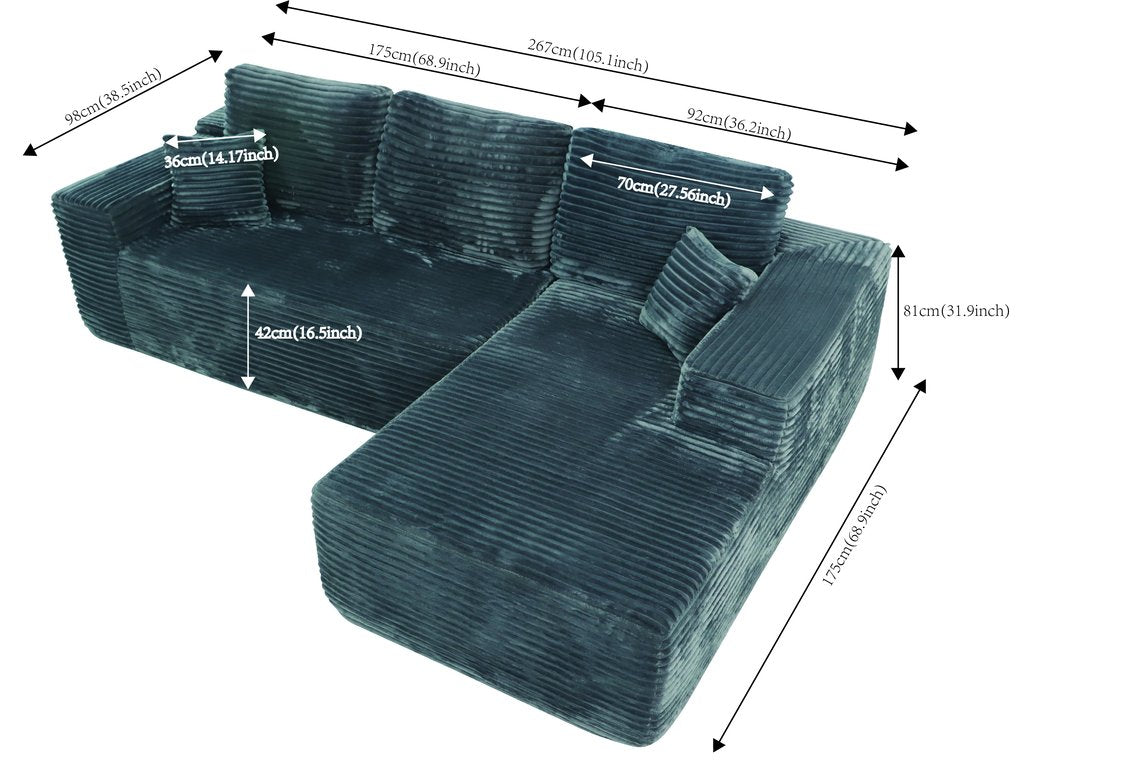 - Modular Sectional Sofa:This sectional sofa featuring a sleek design, clean lines, and high-quality plush corduroy Fabric,This sectional set maximizes space when placed against a wall,this corner sofa effortlessly adds a timeless and sophisticated touch to your home. Designed to be the focal point of attention, it's an ideal choice for elevating the ambiance of living rooms, apartments, and bedrooms.