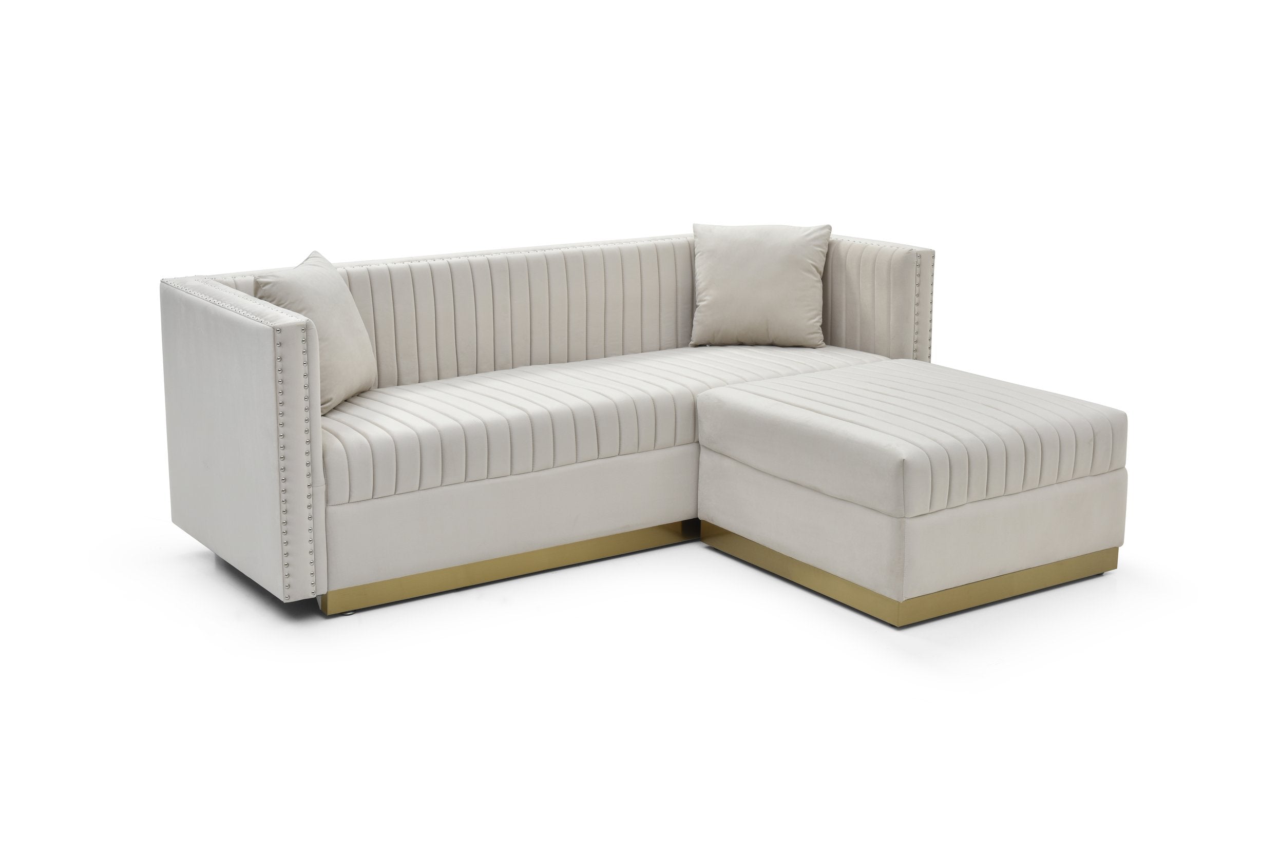 This contemporary sectional sofa brings modern luxury and versatile comfort to apartments and living rooms. Upholstered in soft beige velvet with vertical channel tufting, it creates a sleek, inviting focal point while offering modular seating and a complementary ottoman for added convenience. Ideal for lounging, entertaining, or maximizing corner space, the set includes four matching pillows to complete the look.