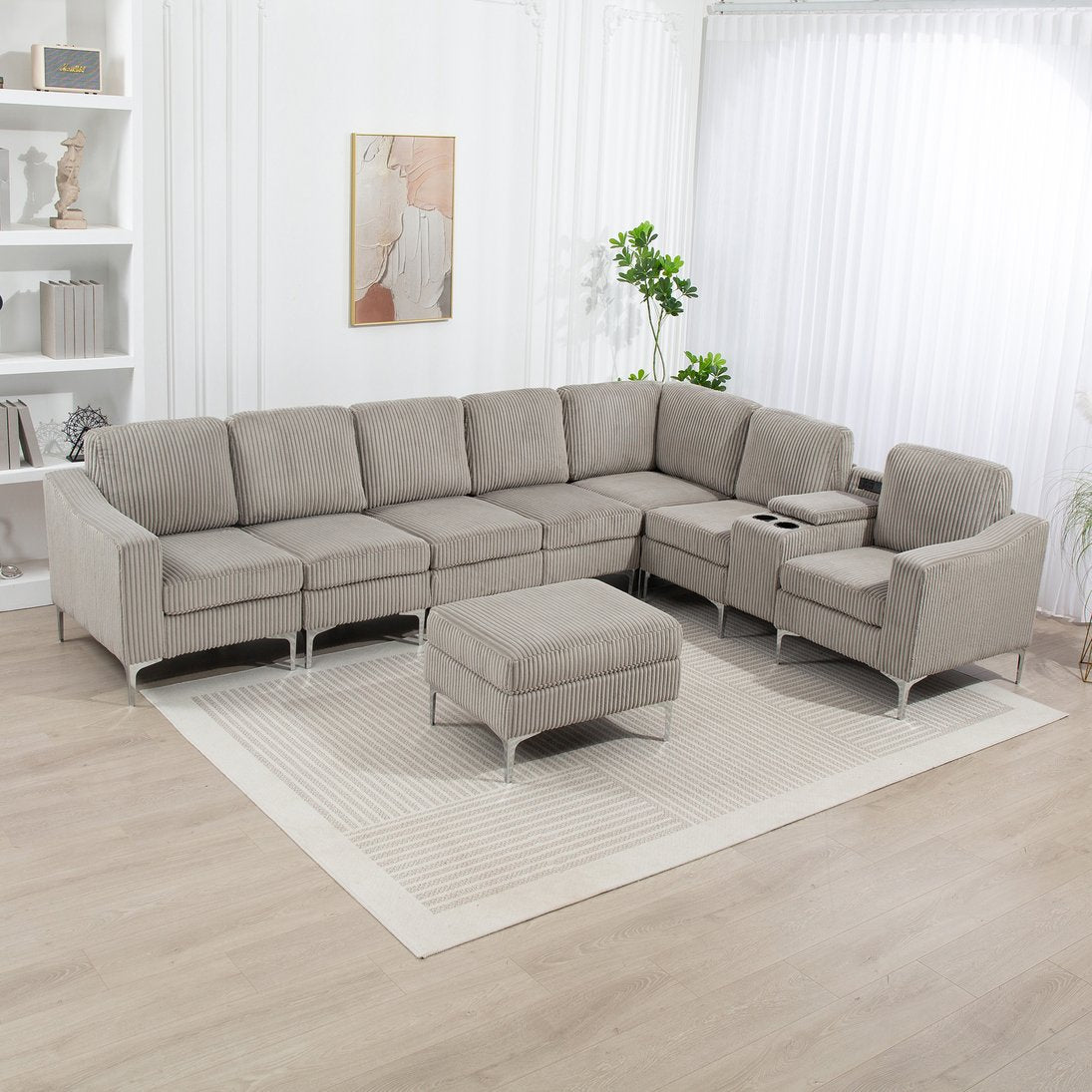 Enjoy versatile, modern comfort with this convertible corduroy sectional designed for family living rooms and apartments. Thoughtfully configured for lounging, entertaining, and everyday use, it combines plush foam seating with durable construction, integrated conveniences like cupholders and USB ports, and a storage ottoman to keep your space organized. The sectional converts easily to adapt to different room layouts and includes an end table for added functionality.