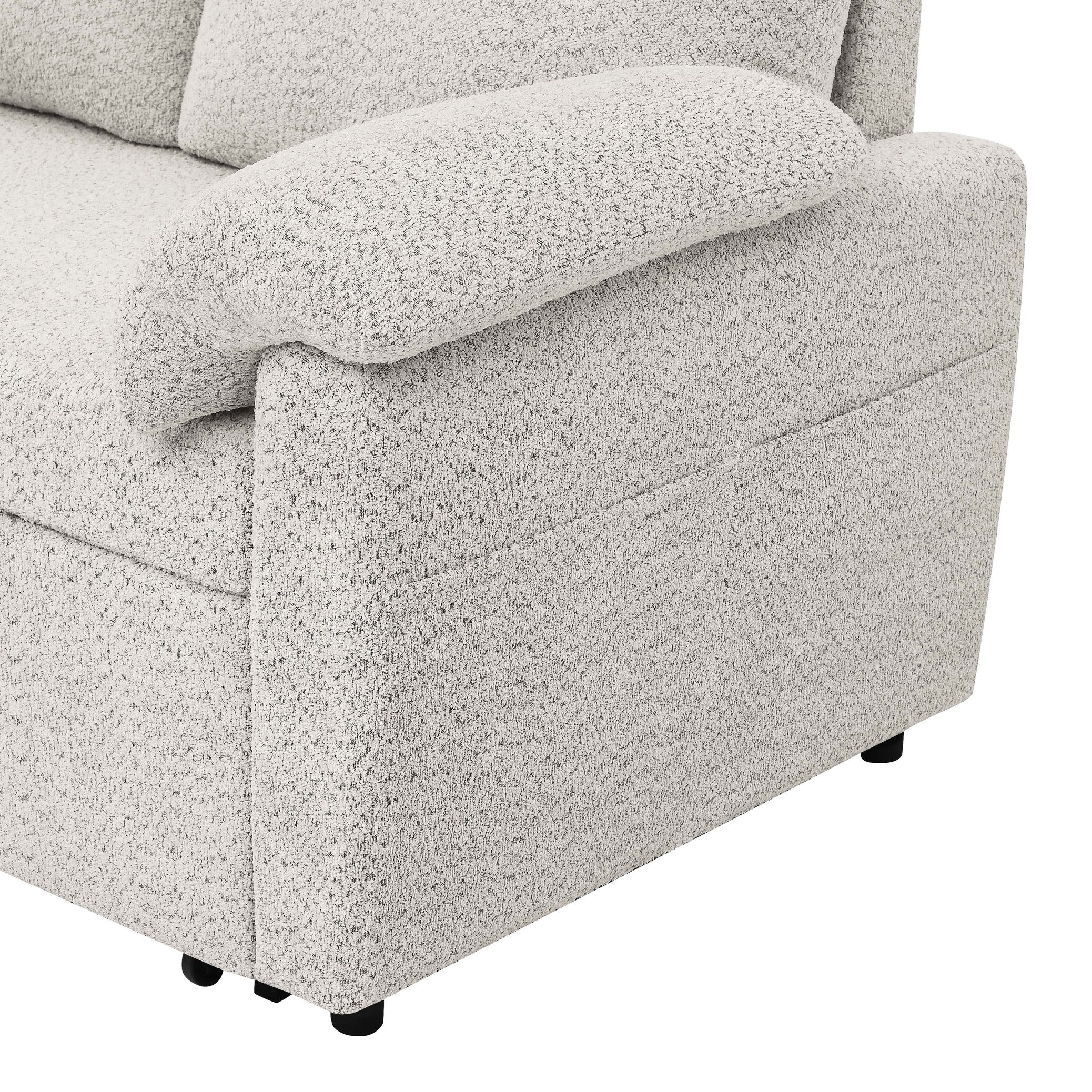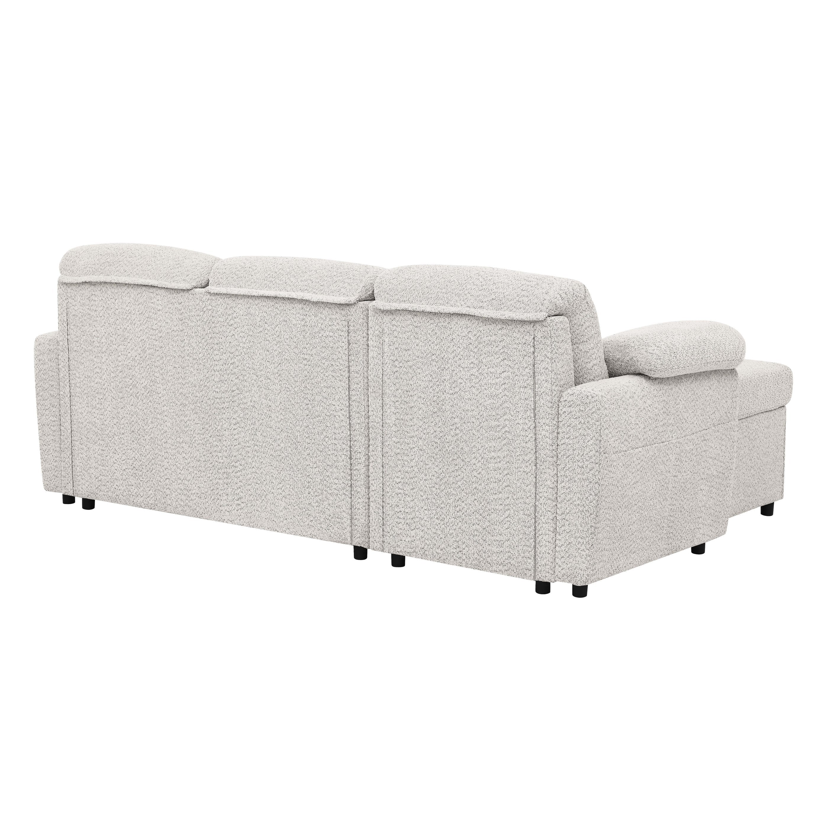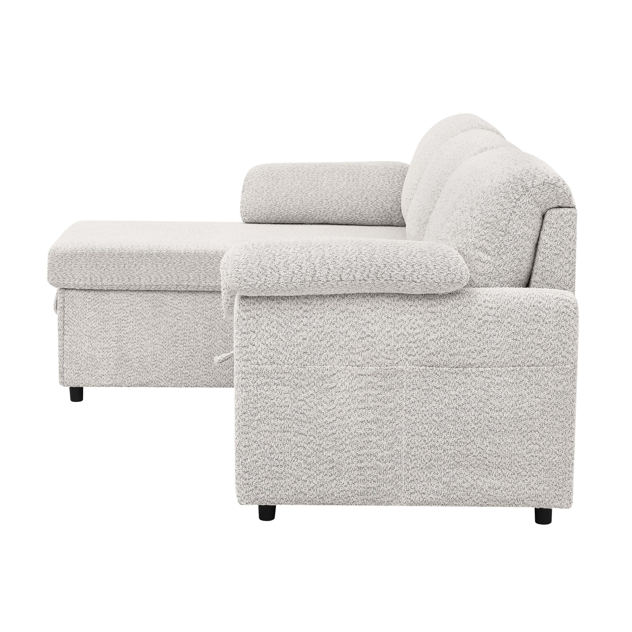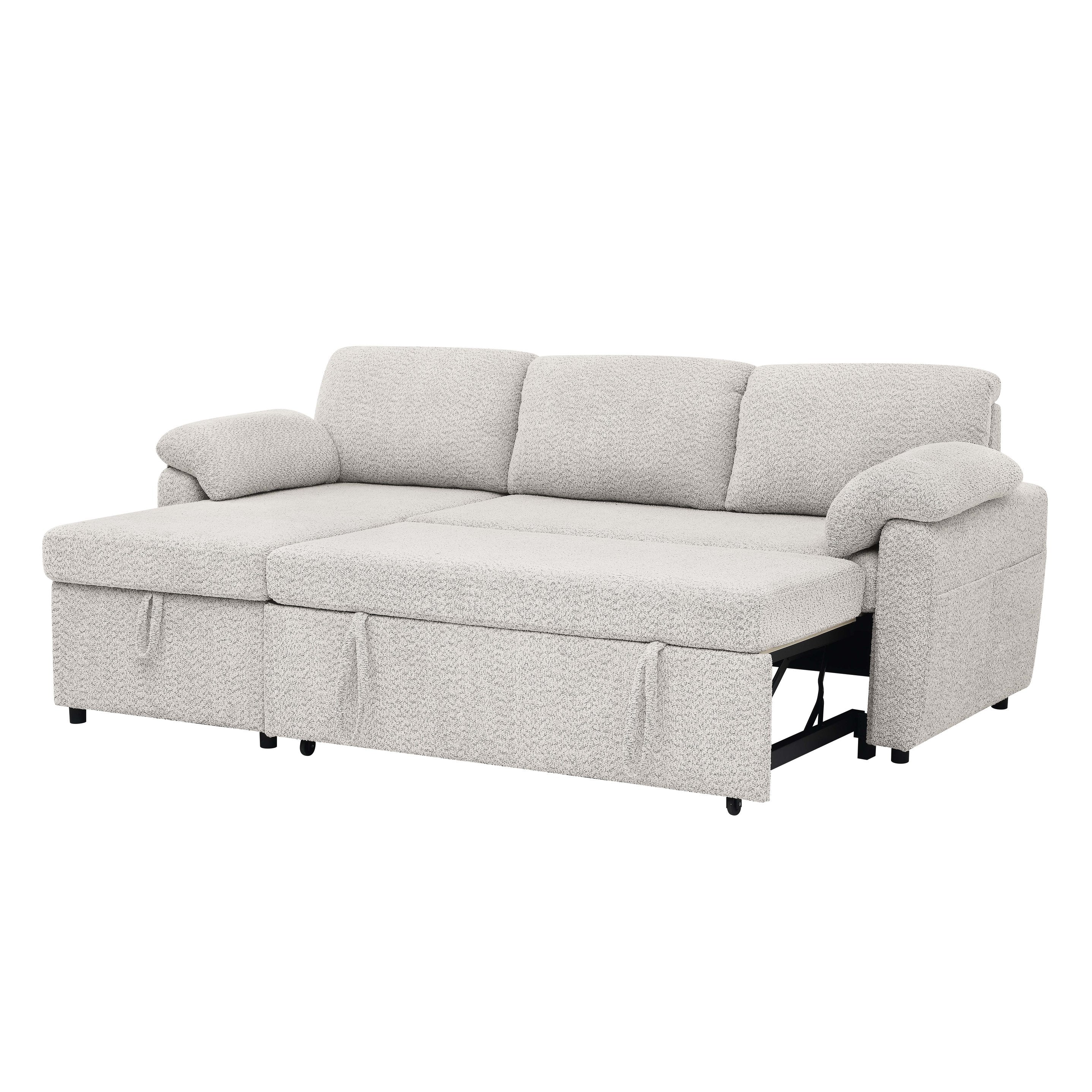 - Featuring a hidden pull-out bed, this sectional instantly converts into a spacious sleeping area, perfect for overnight guests. The chaise lifts to reveal a roomy storage compartment—ideal for blankets, pillows, or seasonal essentials. Soft, textured upholstery in three versatile colors adds a cozy, contemporary feel to any room, while the plush cushions and pillow-style armrests deliver all-day comfort.