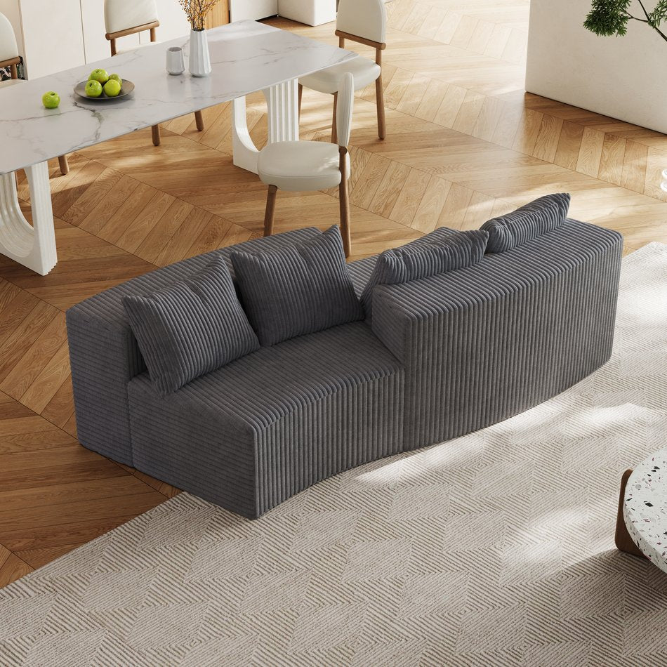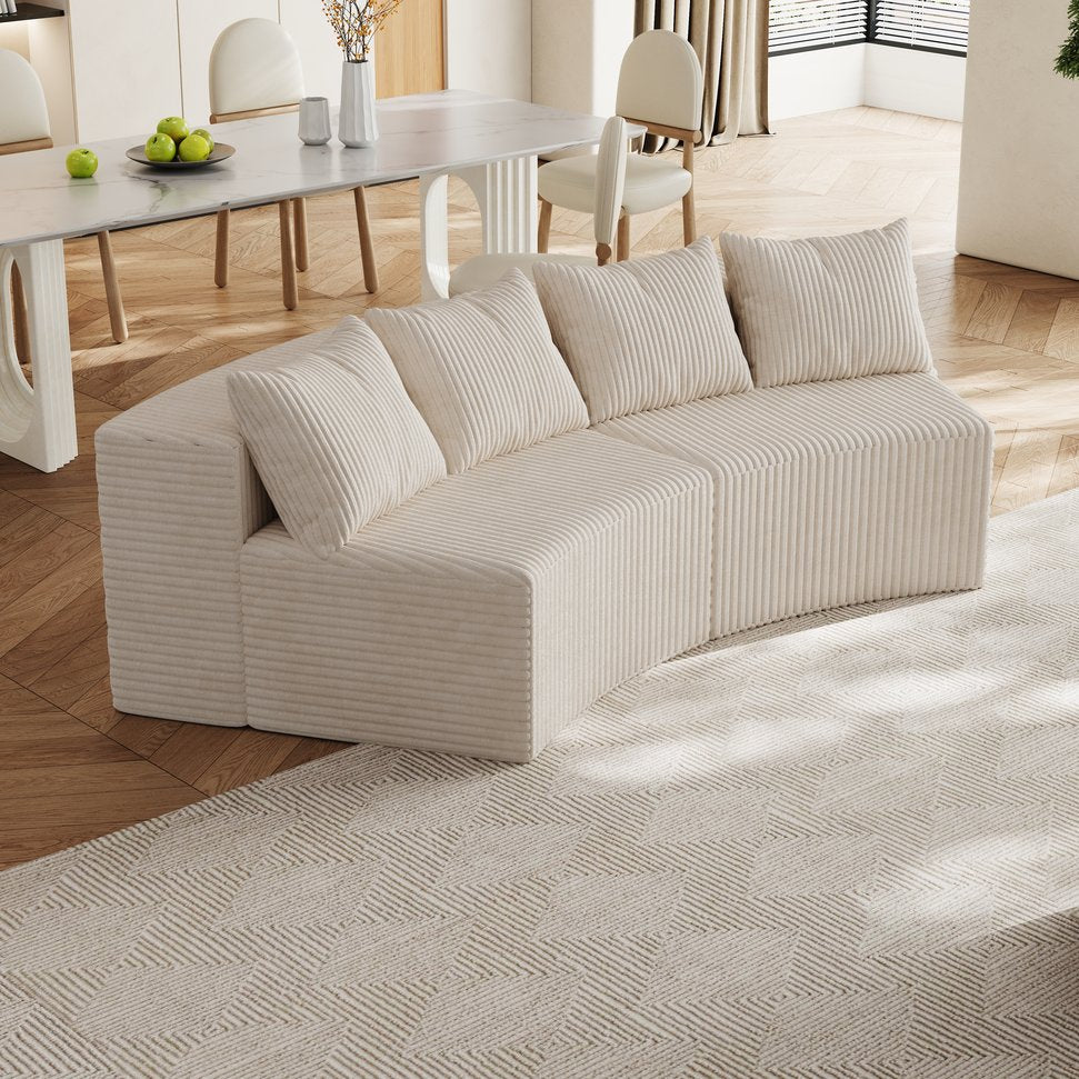 Transform any space into a cozy, stylish retreat with this curved corduroy modular sofa. Designed for comfort and flexibility, its semi-circular silhouette and plush corduroy upholstery create an inviting spot for lounging, reading, napping, or casual conversation. The sofa arrives as two modules and includes four matching pillows, so you can arrange a custom seating layout for bedrooms, living rooms, offices, reading nooks, or lobbies.