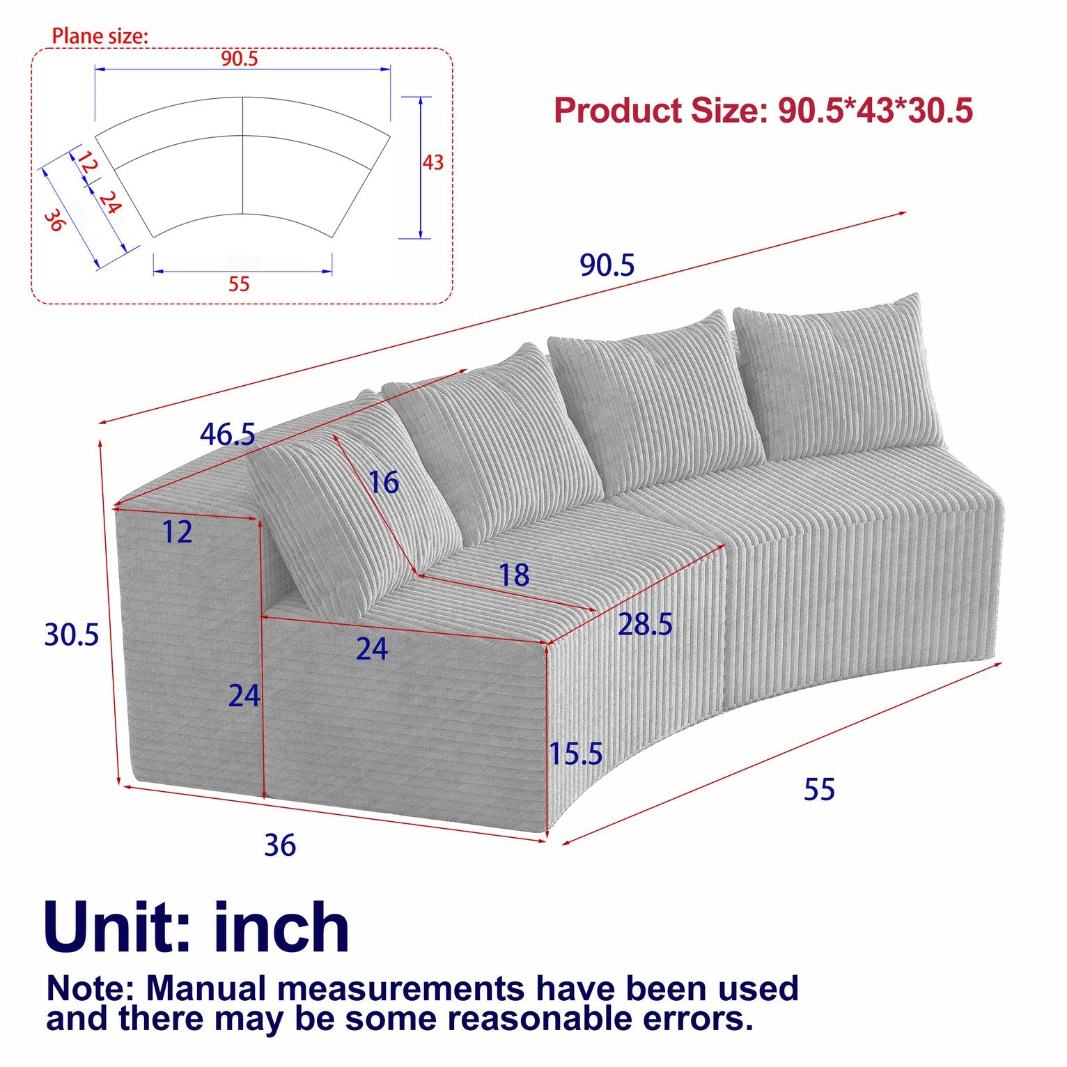 - 【UNIQUE DESIGN】 The curved sofa's unique shape instantly fills your room with a cozy ambiance, featuring beautifully detailed the curves of the armrests, Corduroy fabric, for an elegant look. This comfy couch also comes with 4 pillows for comfortable back support.