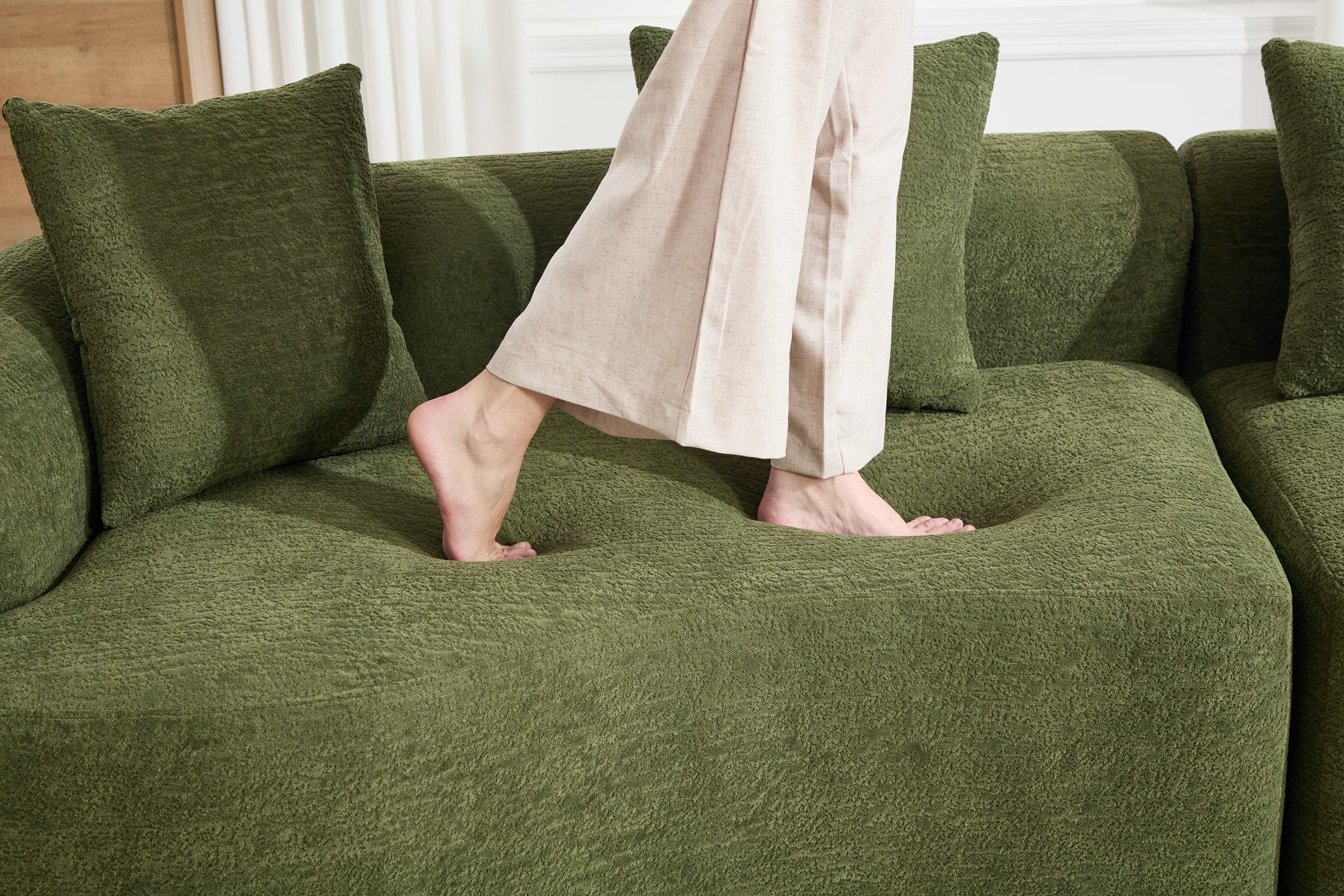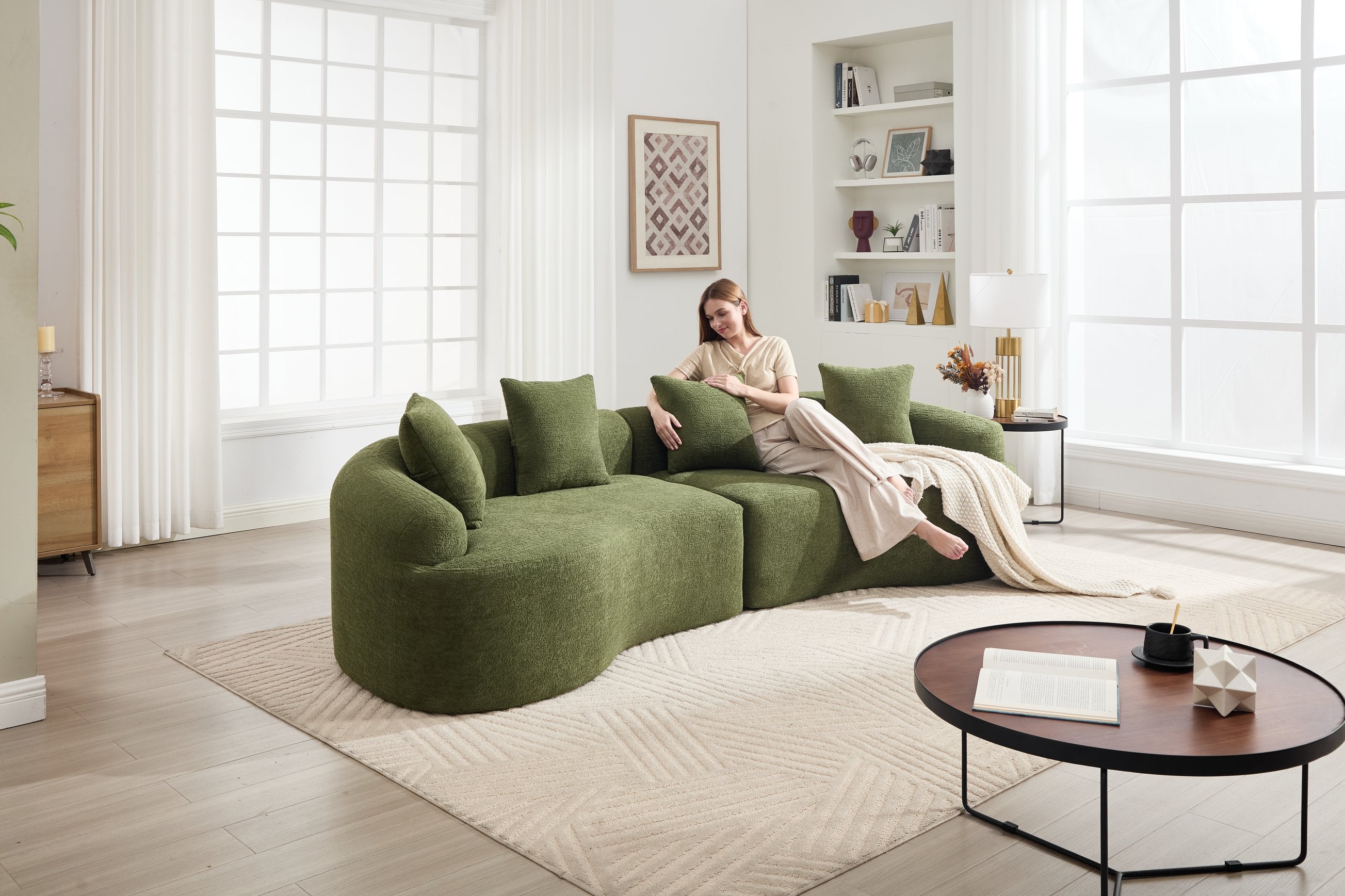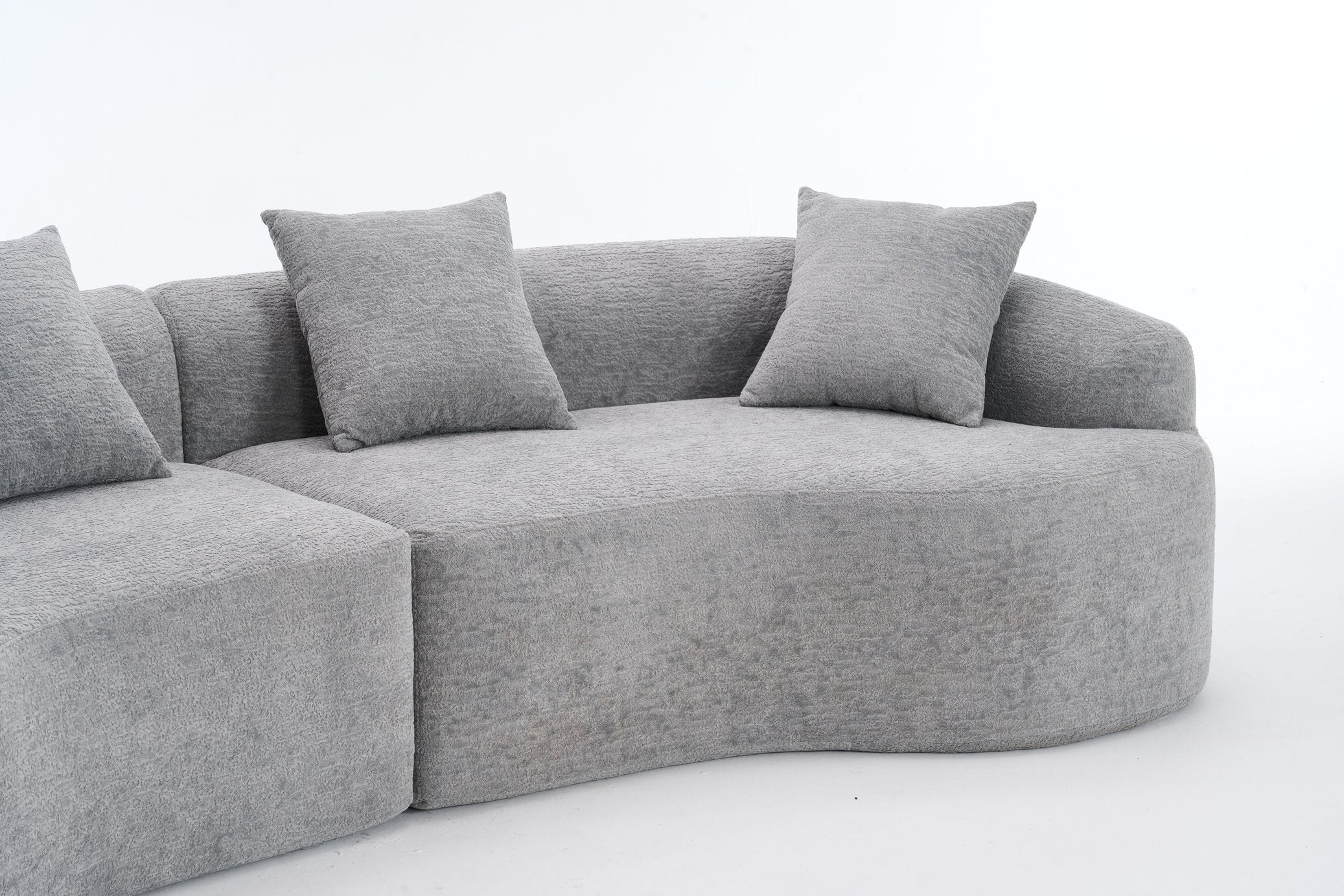 Experience modern comfort with this curved, boneless modular sofa—designed for safe lounging, easy setup, and flexible living. Its soft chenille upholstery and high-density foam construction deliver supportive seating that’s gentle on skin and safe for kids and pets, while the modular pieces let you configure seating for living rooms, bedrooms, apartments, or lounges.