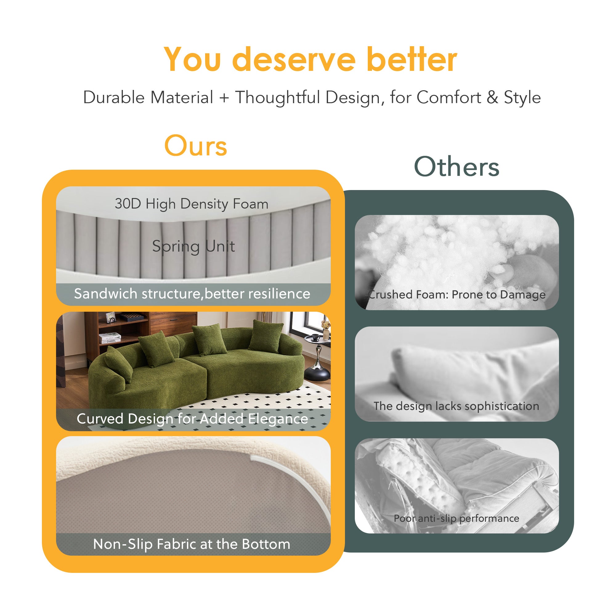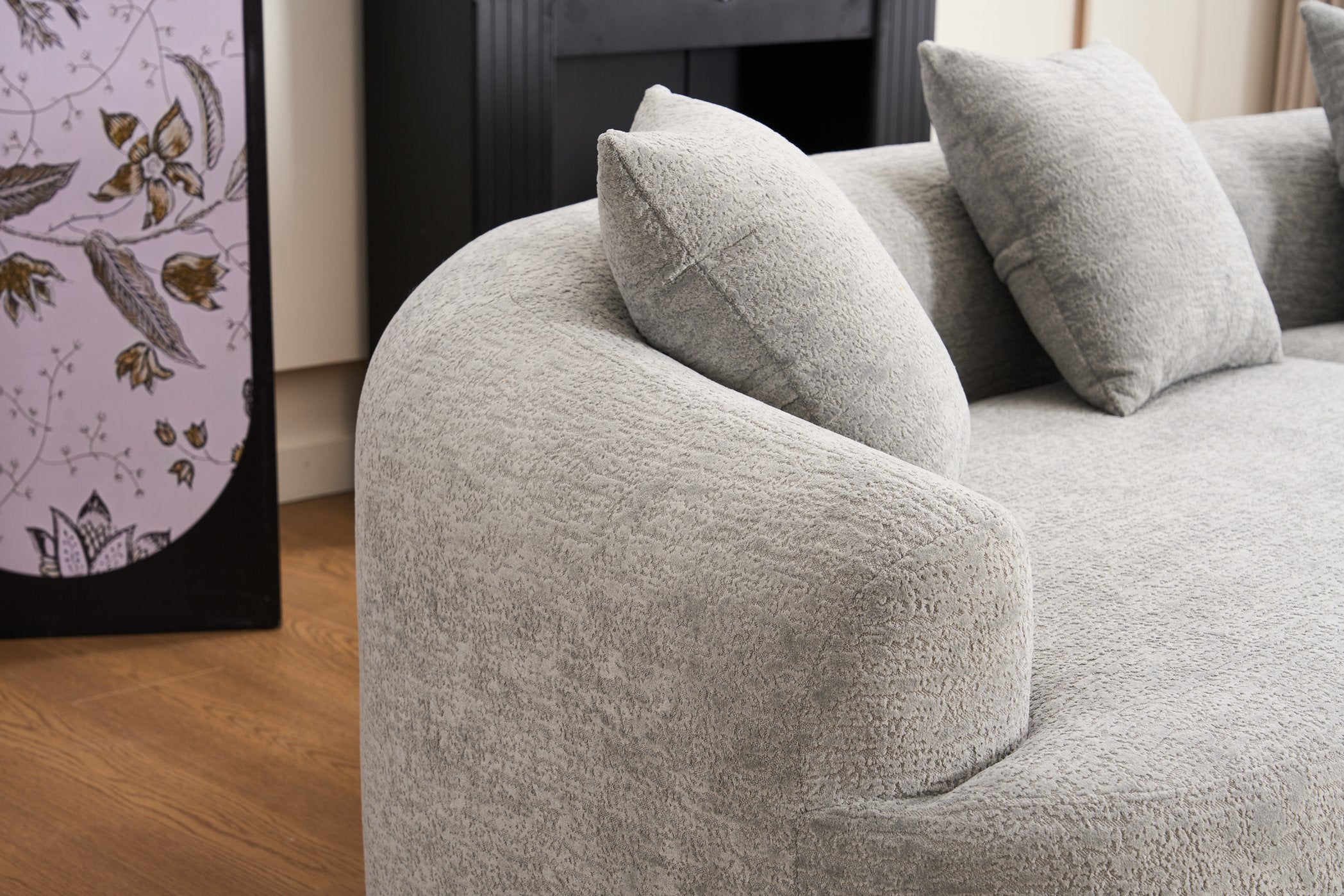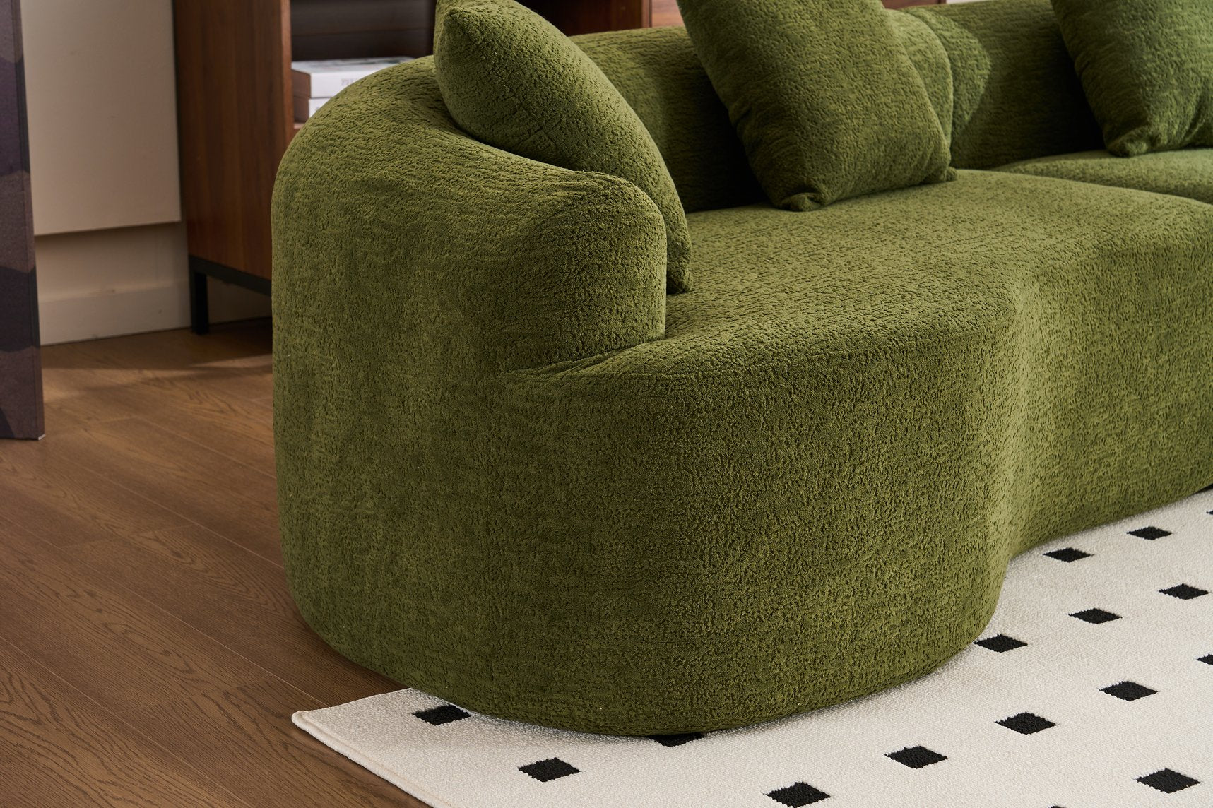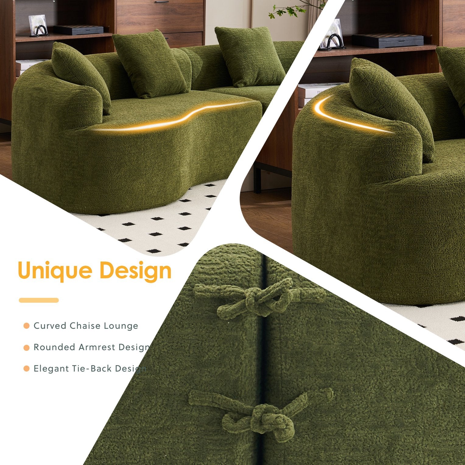 Experience modern comfort with this curved, boneless modular sofa—designed for safe lounging, easy setup, and flexible living. Its soft chenille upholstery and high-density foam construction deliver supportive seating that’s gentle on skin and safe for kids and pets, while the modular pieces let you configure seating for living rooms, bedrooms, apartments, or lounges.