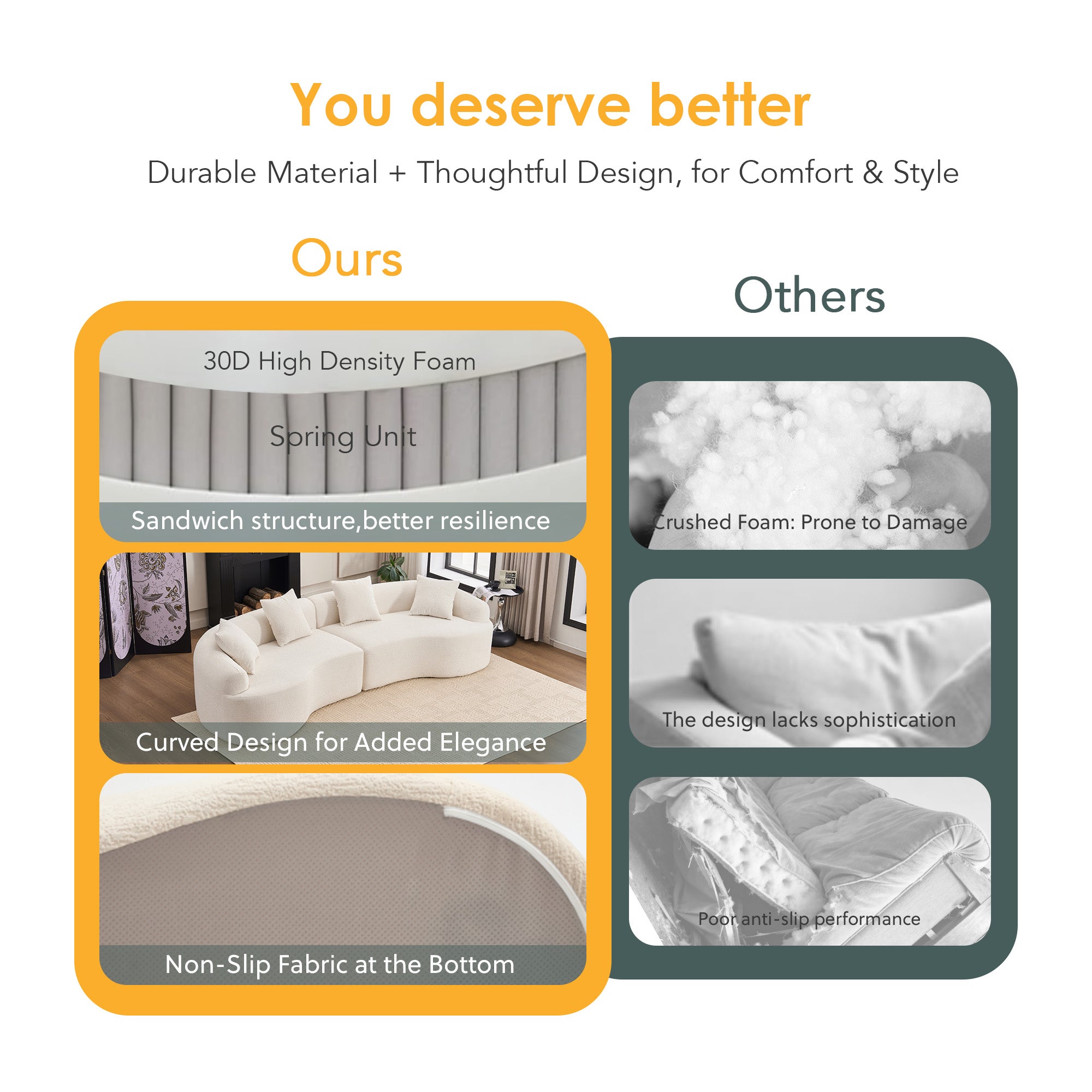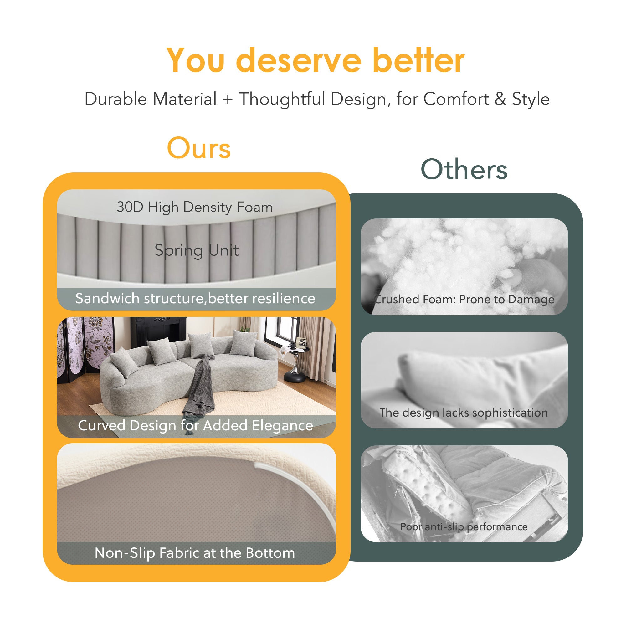 - Design: Curved, boneless silhouette with rounded edges for a modern look and a child- and pet-friendly profile—no sharp corners.