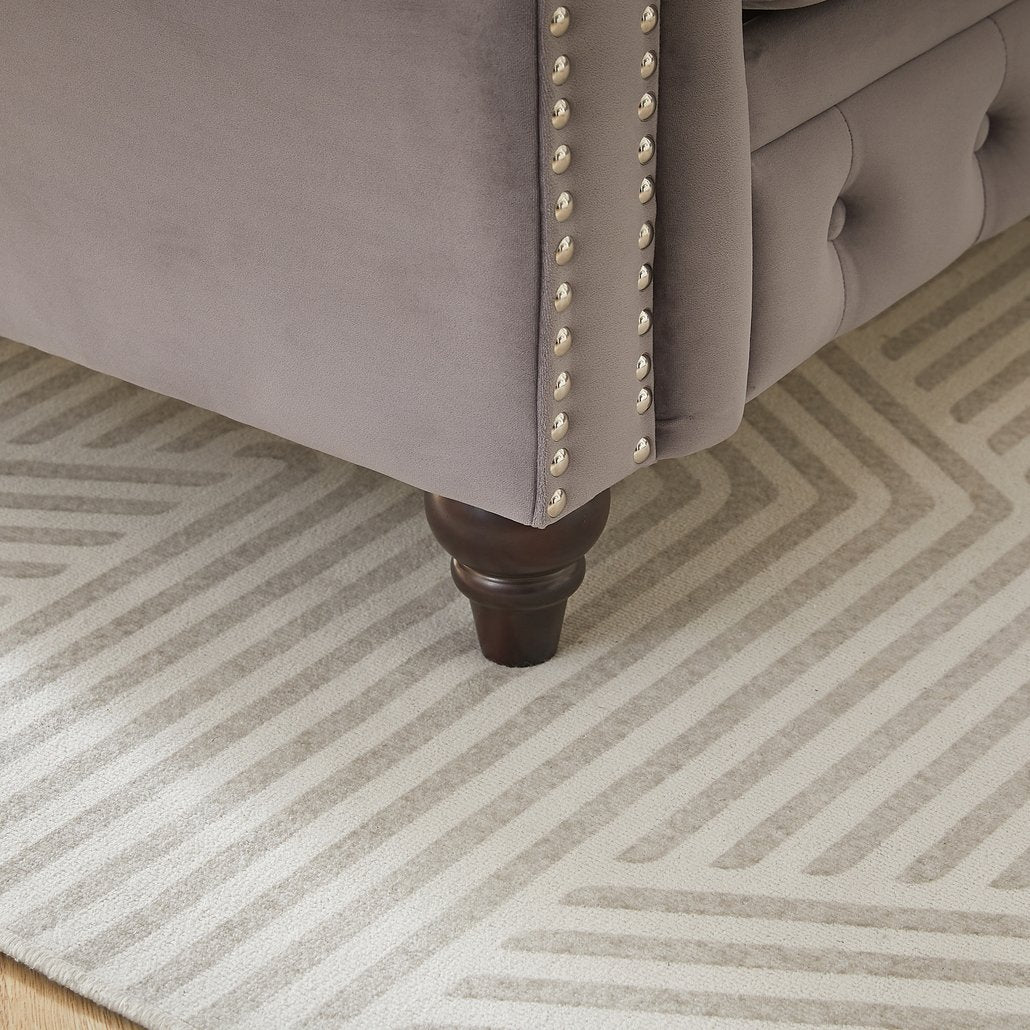 - CLASSIC STYLE: This luxurious sofa features the styling of a modern sofa with hand-tufted buttons, rolled arms, spacious three-person seating and brown wood legs in a classic Chesterfield design. This sofa has a timeless, sophisticated vintage flair that mirrors the décor of the living room, and living room.