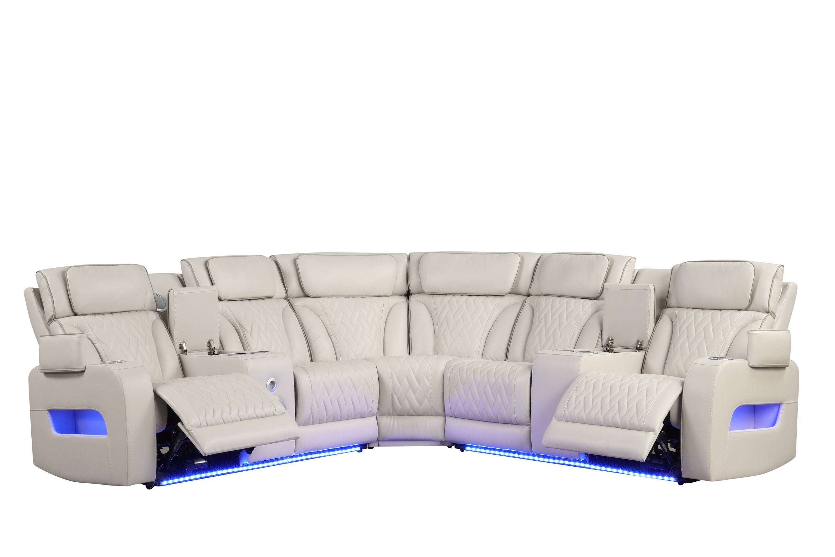 Transform your living space into a high-tech relaxation hub with the Jazz Power Reclining Sectional. Combining quilted leather upholstery with advanced convenience features, this sectional delivers theater-style comfort, customizable ambiance, and smart connectivity—perfect for movie nights, entertaining, or everyday lounging.