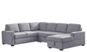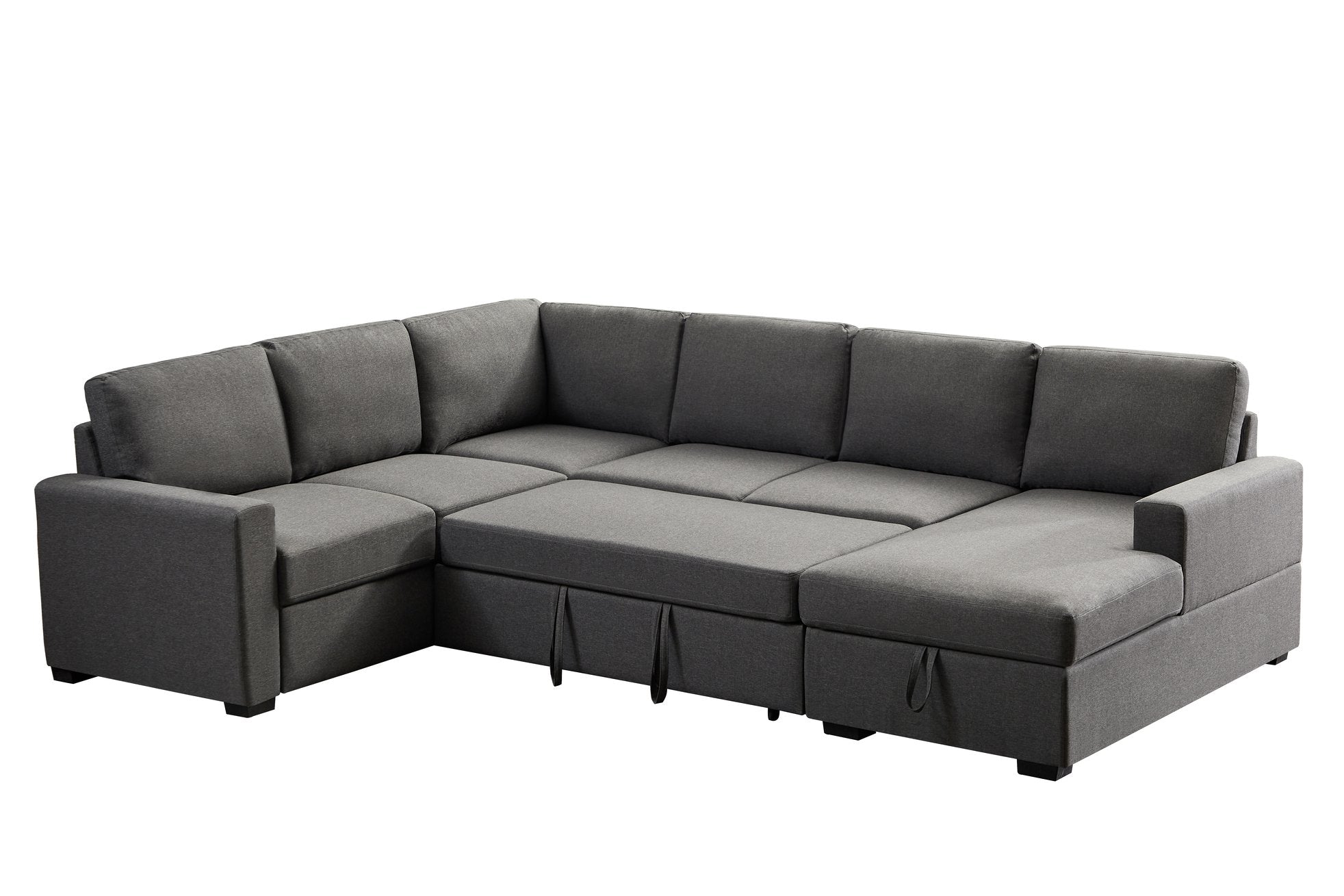 - Configuration: Four-piece sectional including chaise, middle loveseat (with pull-out sleeper), and complementary seating pieces for flexible layout options