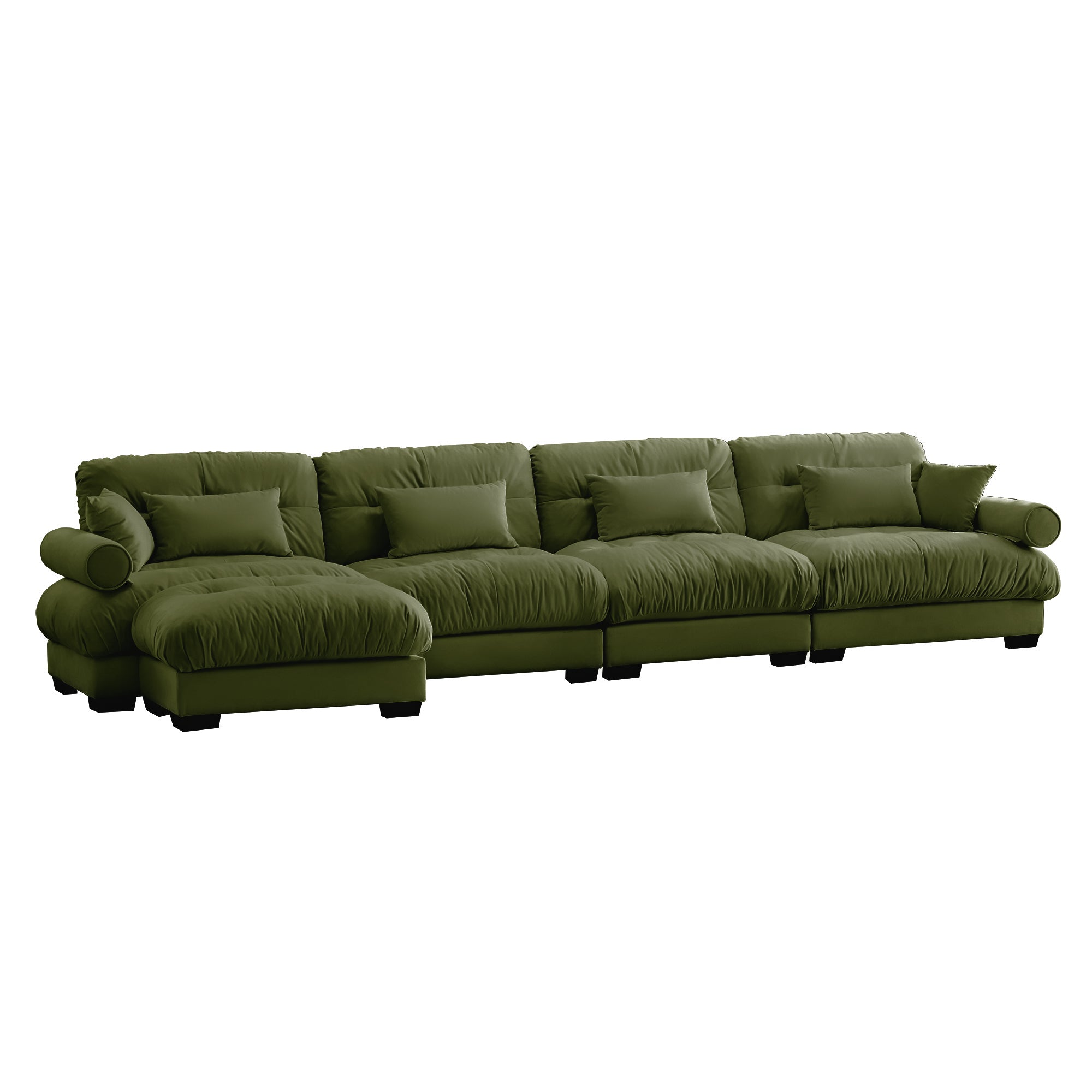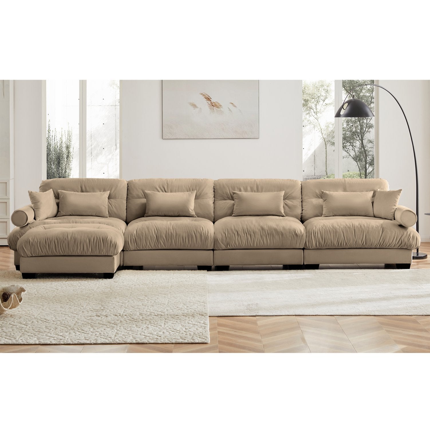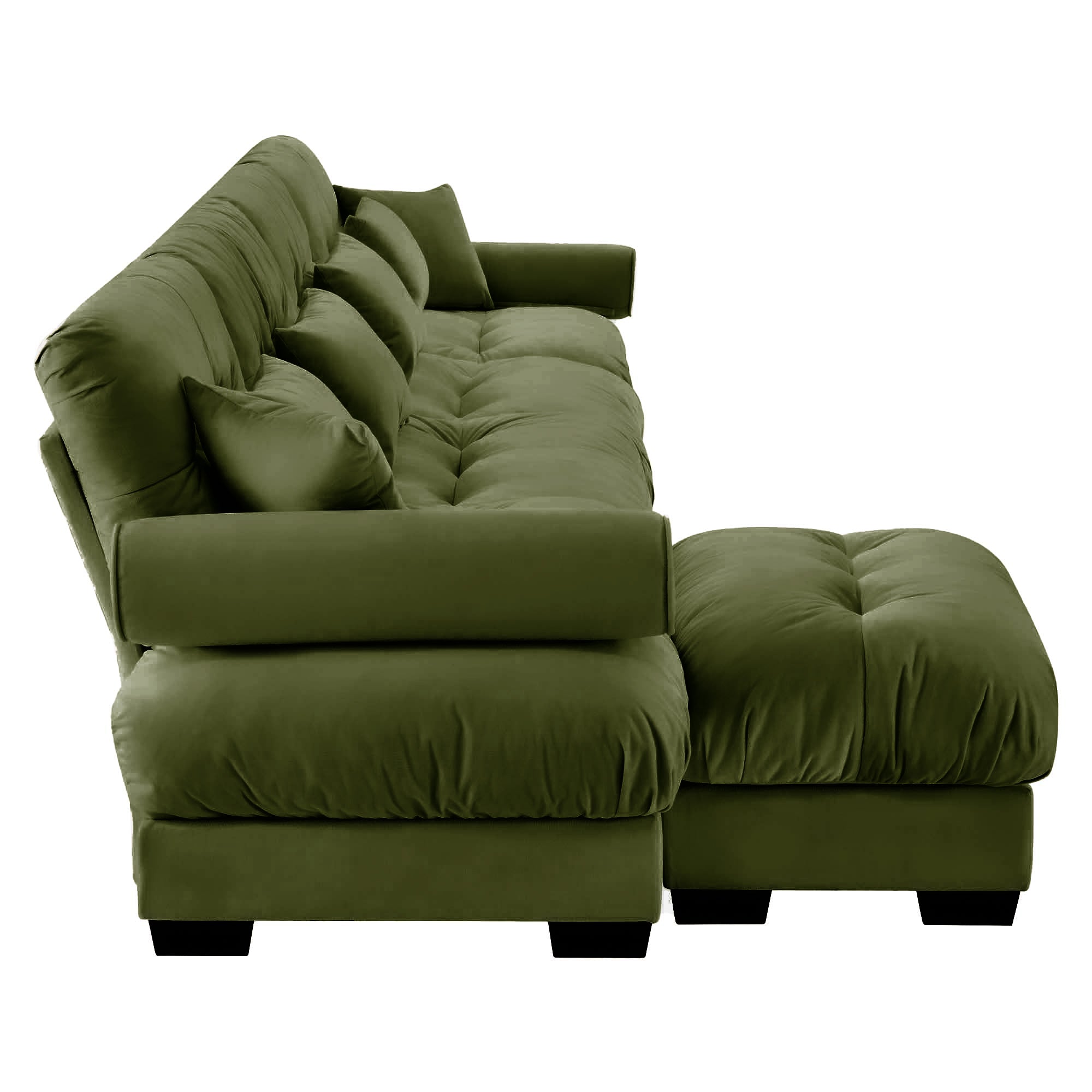 Sink into cloud-like comfort with this modern L-shaped sectional, designed to elevate your living room with plush velvet upholstery and versatile modularity. Thoughtfully crafted details—bolstered round armrests, deep cushions, and included throw and waist pillows—combine for a supportive, stylish seating experience that adapts to your space and lifestyle.