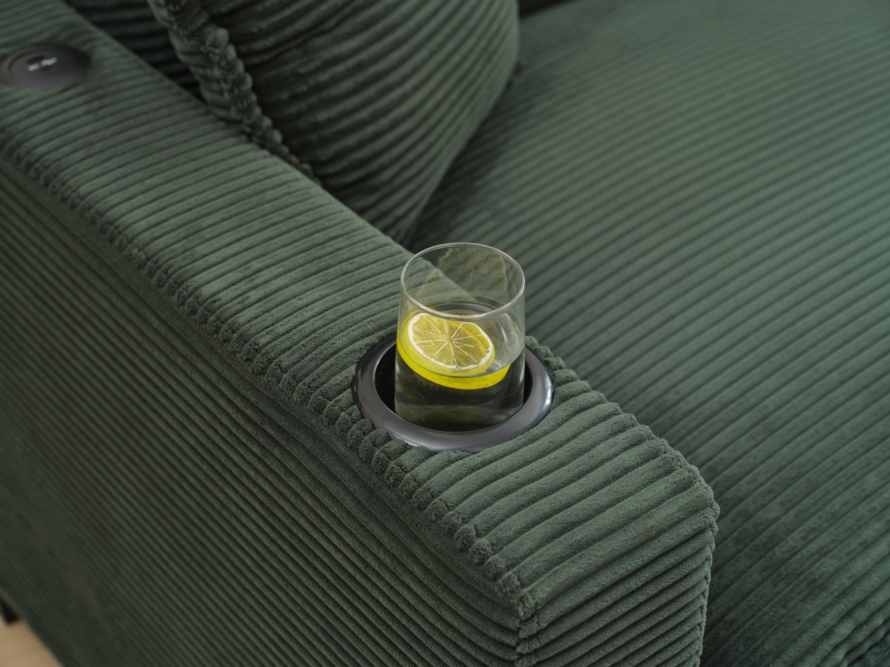 Bring modern comfort and convenience to your living space with this L-shaped 2-seater sectional and matching footstool. Upholstered in soft, skin-friendly green corduroy with subtle stripes, this compact convertible sofa combines plush seating, thoughtful features like a built-in USB port and cup holder, and a durable high-resilience foam core for everyday relaxation in apartments, offices, or cozy living rooms.