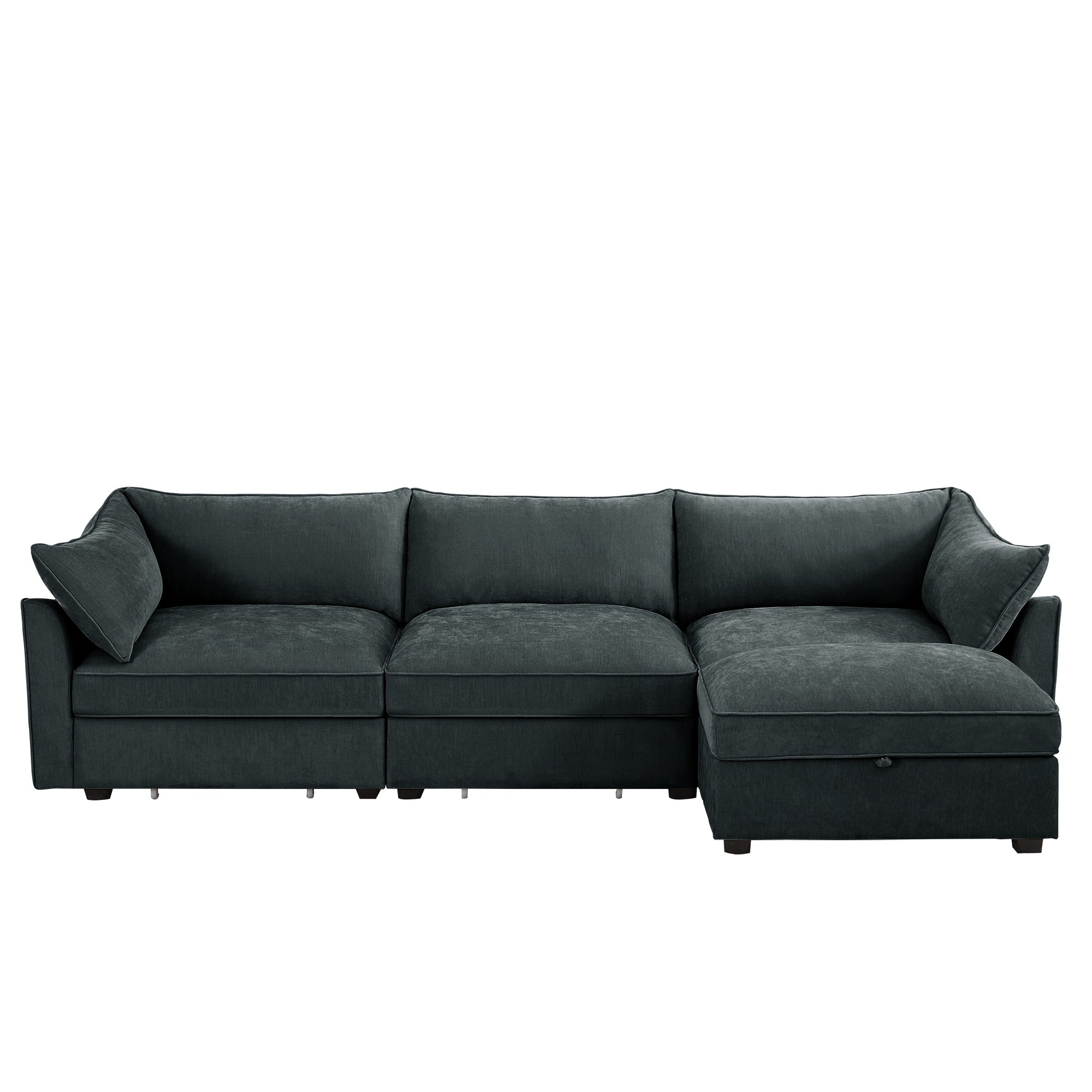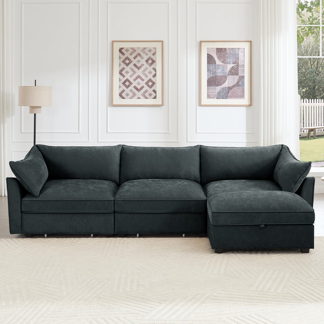 Experience modern comfort and smart functionality with this L-shaped 3-seater sectional sofa featuring a movable ottoman. Upholstered in soft, durable chenille, the design blends clean lines and crescent-shaped contours with thoughtful storage solutions for a streamlined, high-end living room look. Ideal for everyday lounging or entertaining, this sectional balances cozy seating with practical organization.