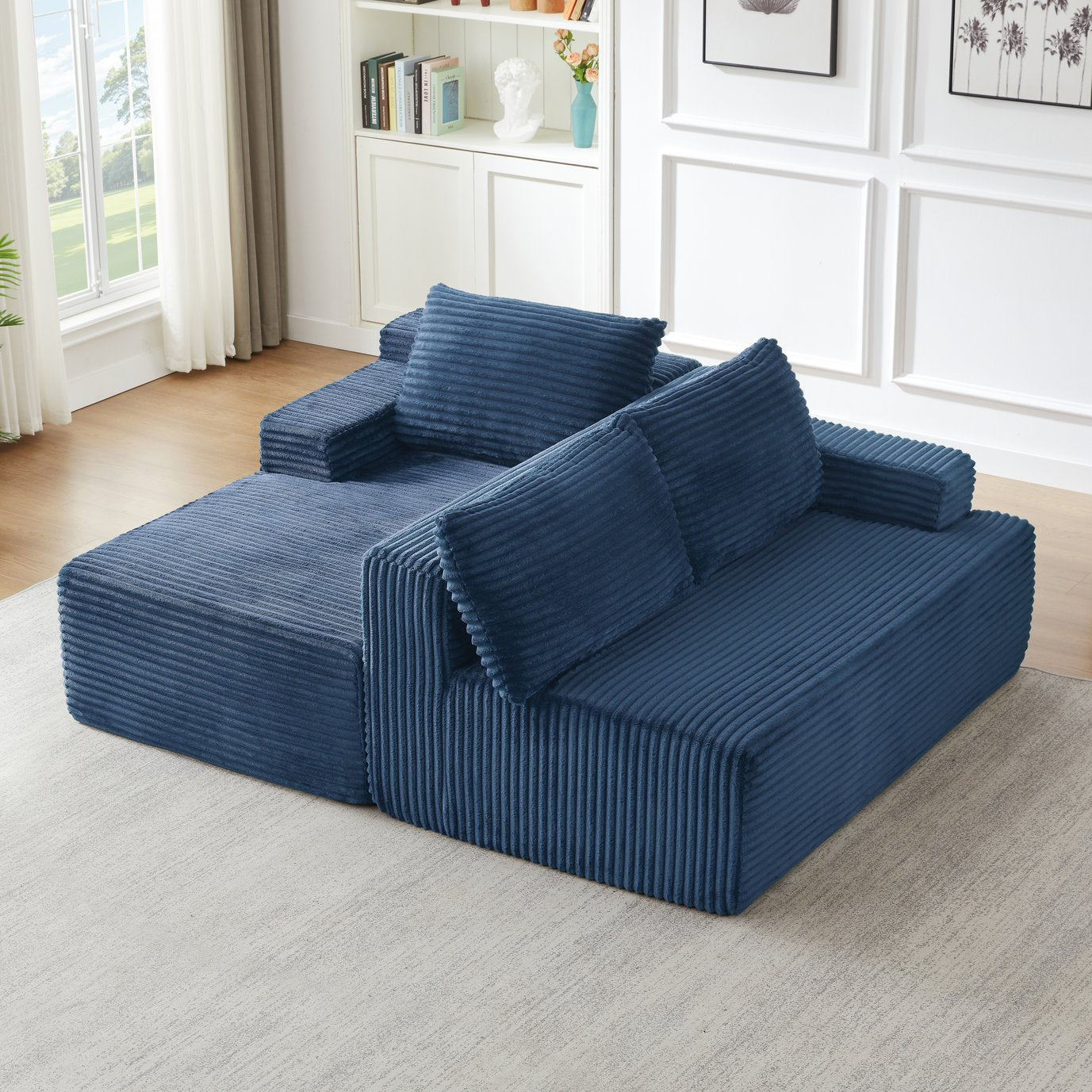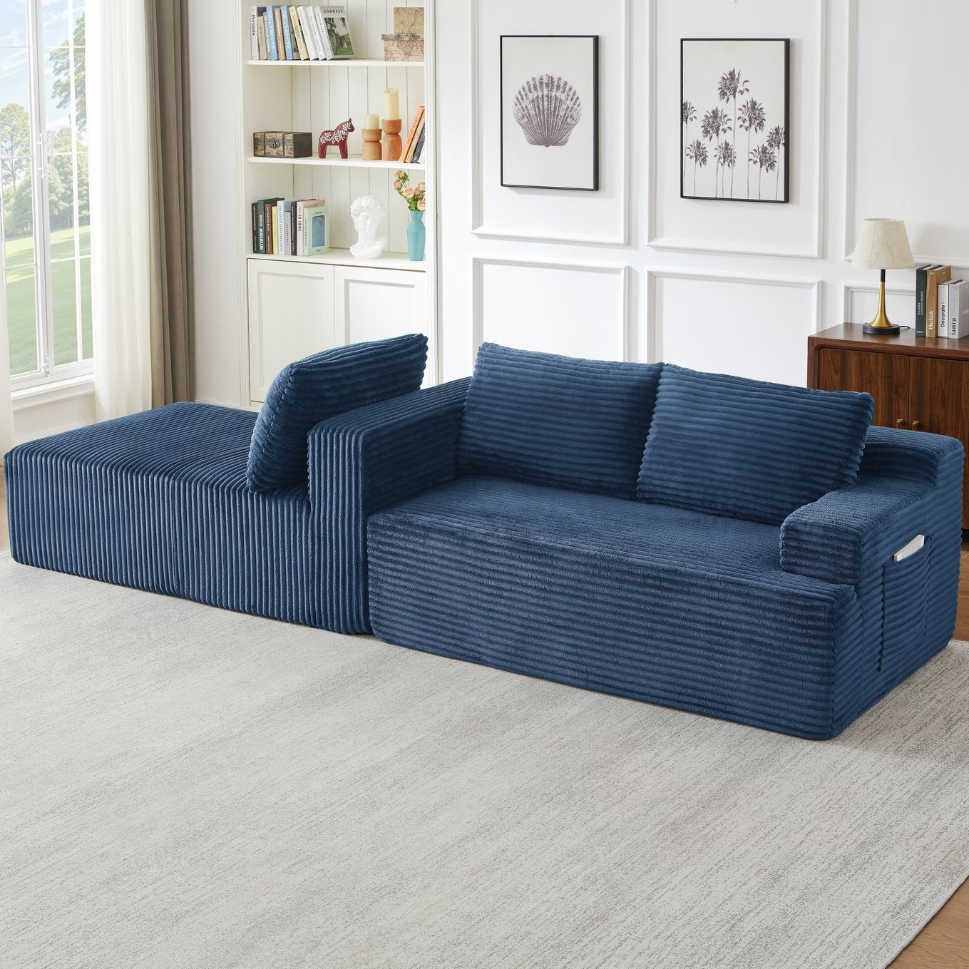Sink into cloud-like comfort with this L-shaped sectional designed for modern living. Upholstered in durable blue corduroy and built with a sponge and pocket-spring core, it delivers plush support for lounging, napping, or entertaining — all without the hassle of assembly. Ideal for apartments, living rooms, bedrooms, or guest spaces, the modular design maximizes seating while remaining compact and easy to place.
