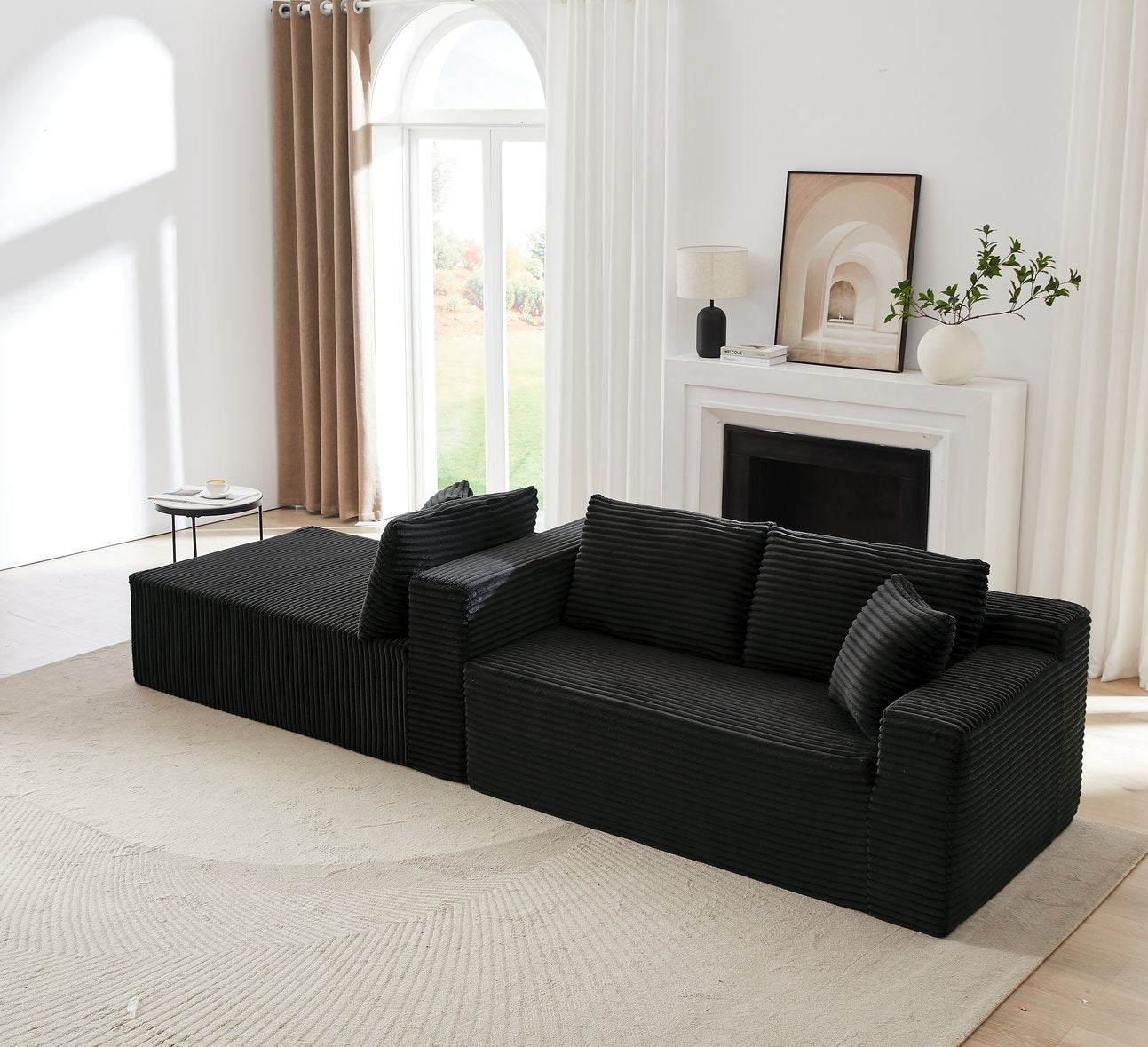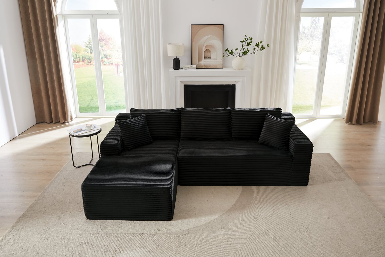 Sink into cloud-like comfort with this modular L-shaped sectional—designed for immediate relaxation, versatile placement, and long-lasting support. Upholstered in durable corduroy, it blends casual elegance with family-friendly resilience and converts effortlessly into a sleeper area for guests or cozy movie nights. No tools or assembly required—just unpack, let it expand, and enjoy.