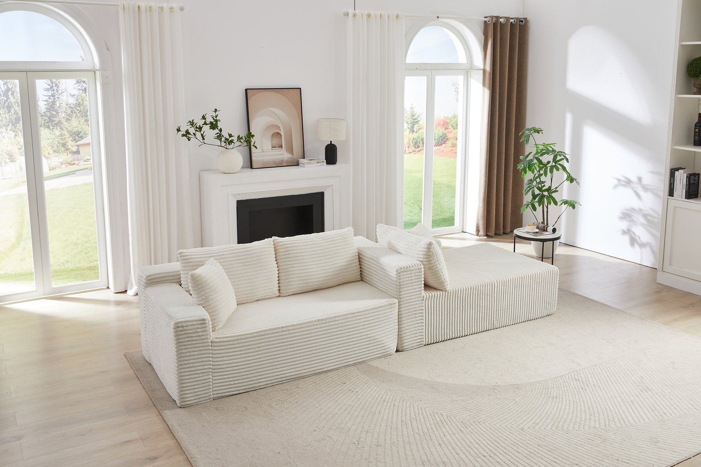 Sink into cloud-like comfort with this L-shaped modular sectional—designed for effortless relaxation and instant use. The plush corduroy upholstery and sponge-plus-pocket-spring support deliver a soft yet supportive seating experience, while the modular layout fits living rooms, bedrooms, and apartments. No tools or assembly required: unpack, allow to expand, and enjoy a cozy sleeper-ready seating solution that balances style, durability, and everyday practicality.