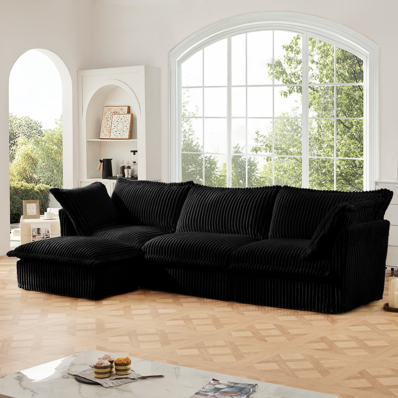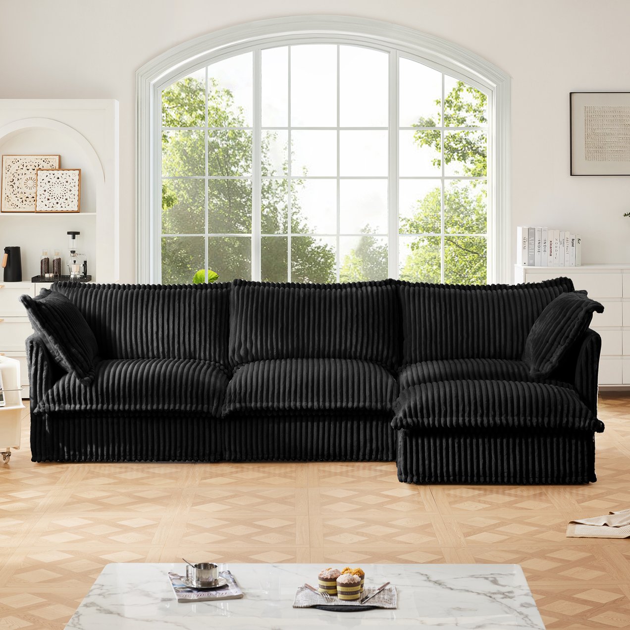 Sink into cloud-like comfort with this versatile L-shaped slipcovered sectional—designed for modern living rooms, home theaters, or offices. Upholstered in soft black corduroy with plush high-back and side pillows, this oversized 3-seater set combines a deep, supportive seat with flexible modular options and easy-care removable covers for busy households.