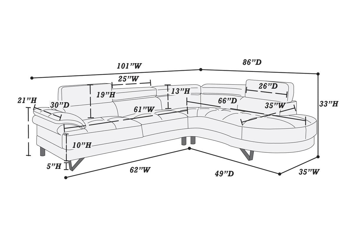 - Right-facing Chaise: 85" W x 38" D x 29"-34" H