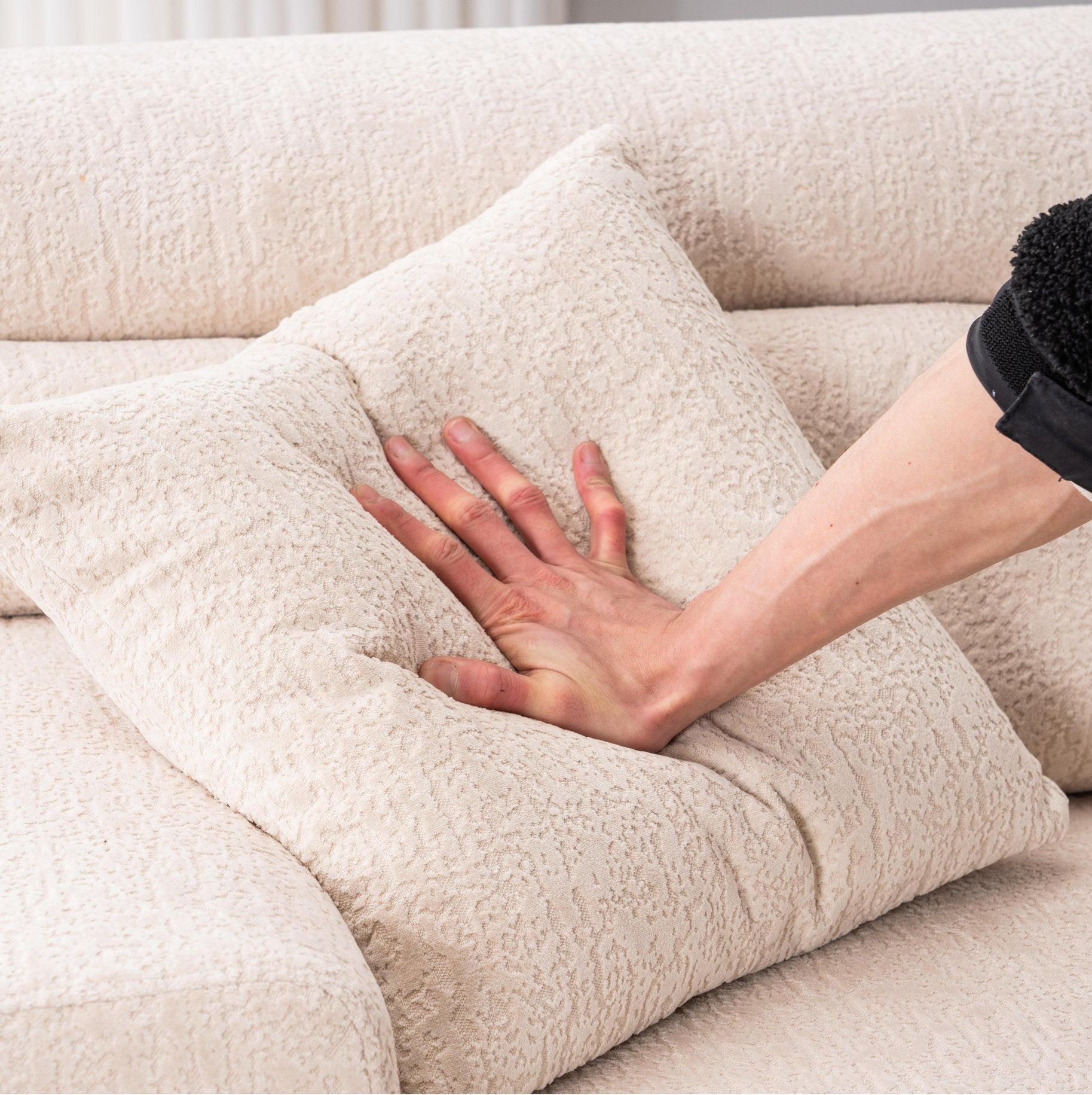 - Compression Sofa with wider armrests, deeper seat depth, and raised backrest provide a more comfortable seating experience. The 2 small pillows included for free can be cradled in your arms or leaned against your back, allowing you and your family to relax even more. The super wide sofa gives every part of your body plenty of space to relax.