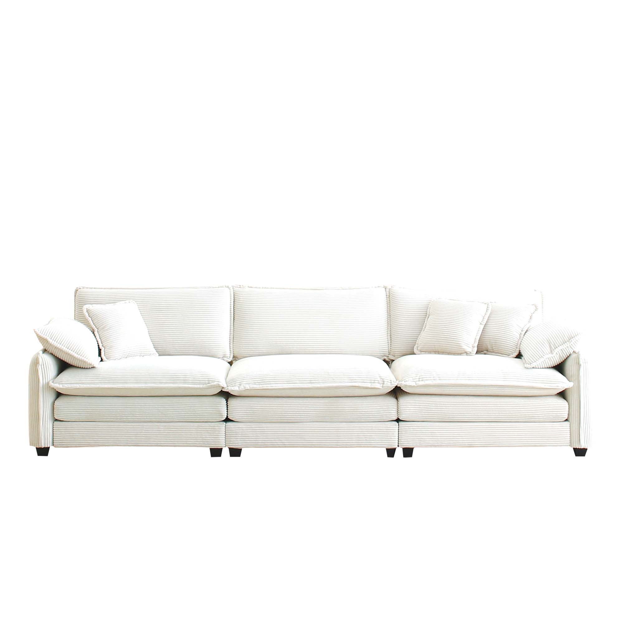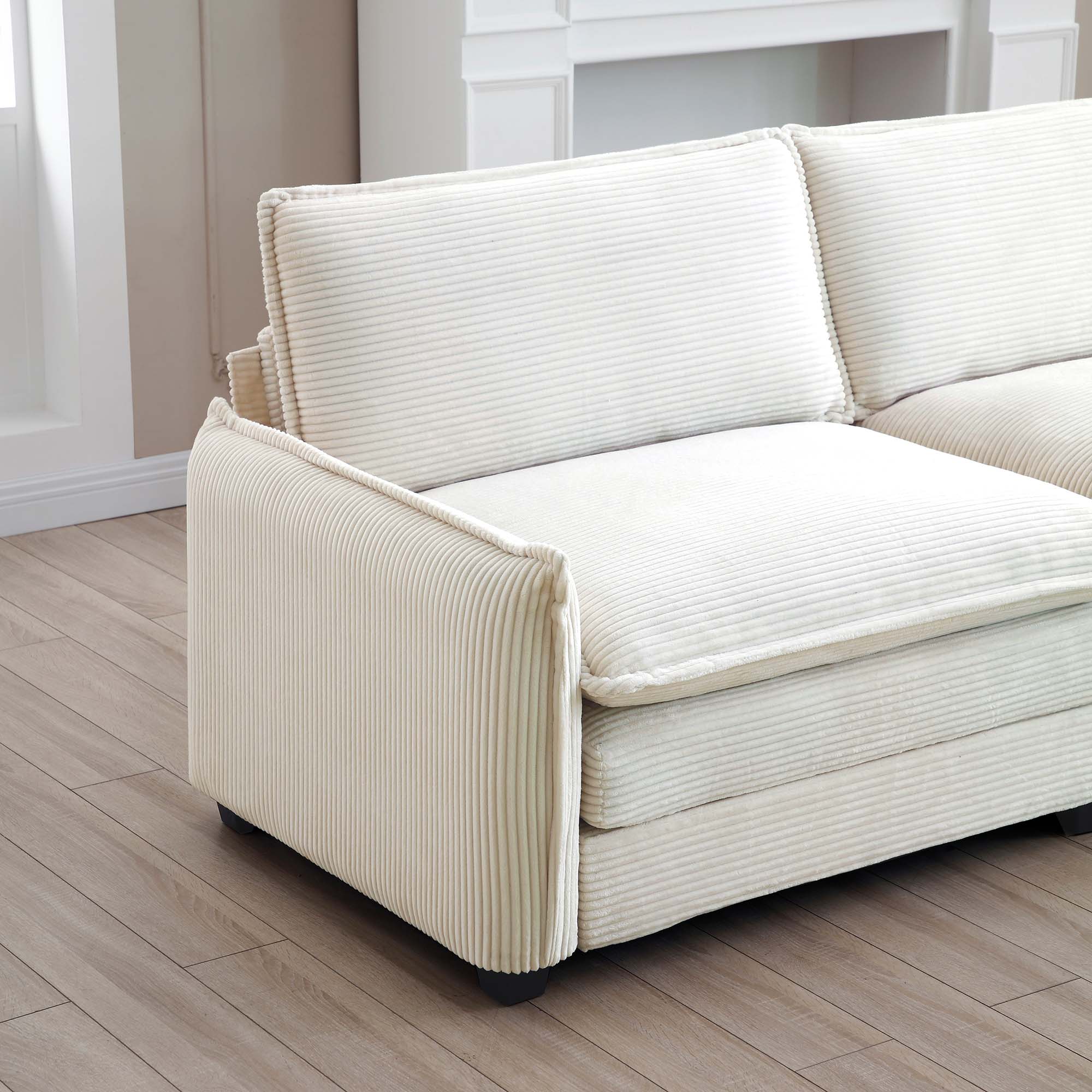 Transform your living space with this Mid-Century Modern 3-seater sectional—where retro charm meets contemporary comfort. Upholstered in plush beige corduroy, the sofa combines clean, streamlined silhouettes with cozy, resilient cushions for a welcoming centerpiece that complements a variety of decor styles. Thoughtfully designed for relaxation and everyday living, it includes two arm pillows and three throw pillows for added support and style.