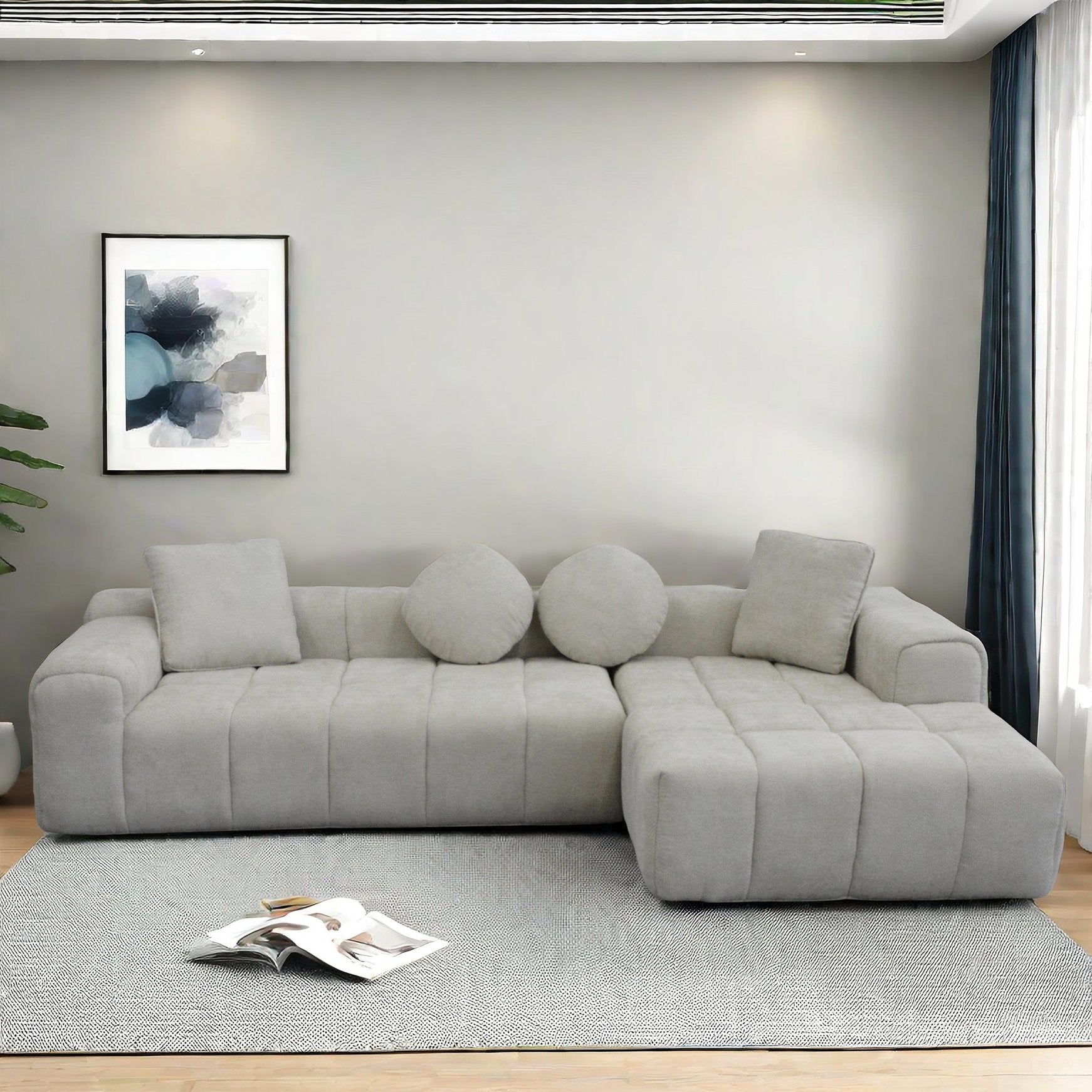 - Design: Modern, minimalist silhouette with a right-side L-shape chaise for comfortable lounging