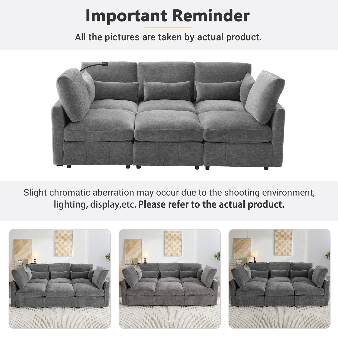 This modern modular sectional sofa combines contemporary style, adaptable functionality, and everyday convenience. Designed for flexible living spaces, it reconfigures easily between U-shaped, L-shaped, and sofa-bed arrangements to accommodate family gatherings, movie nights, or overnight guests. Upholstered in soft chenille with supportive pocket-spring seating and three lumbar pillows, it delivers comfort without sacrificing clean-lined aesthetics. Integrated features like two USB ports and a built-in phone holder keep devices charged and accessible, while a movable ottoman adds lounging versatility.