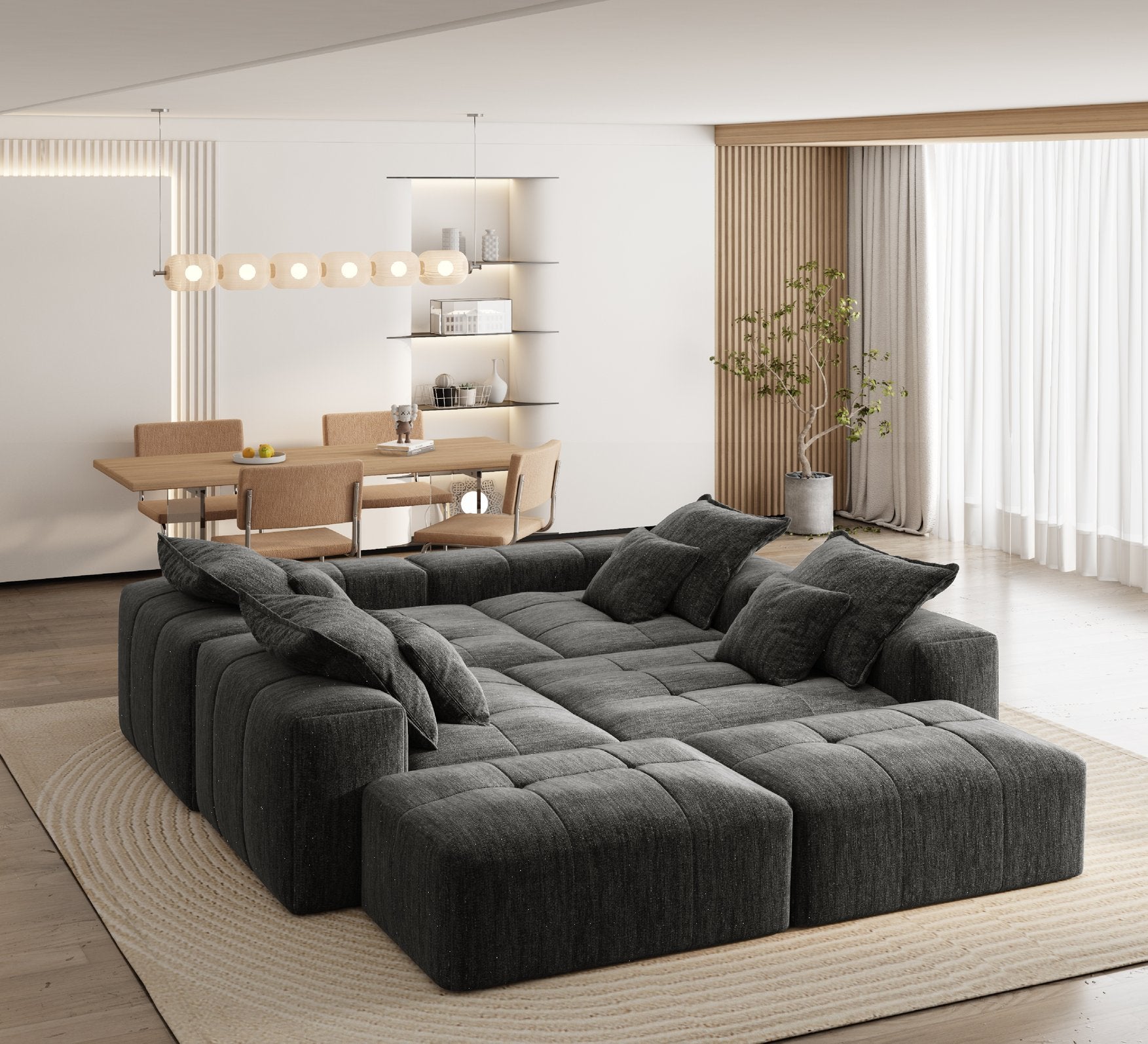 Create a warm, modern gathering spot with this oversized modular sectional sofa. Upholstered in sparkling chenille, the sofa combines durable pocket-spring support and plush foam cushioning for a balance of resilience and softness. Its modular, 8-piece DIY configuration and included 8 pillows let you tailor the layout to your space — no assembly required. Available in grey, beige, black, or blue, the sectional is designed for residential living rooms and open-plan areas where comfort and contemporary style matter.