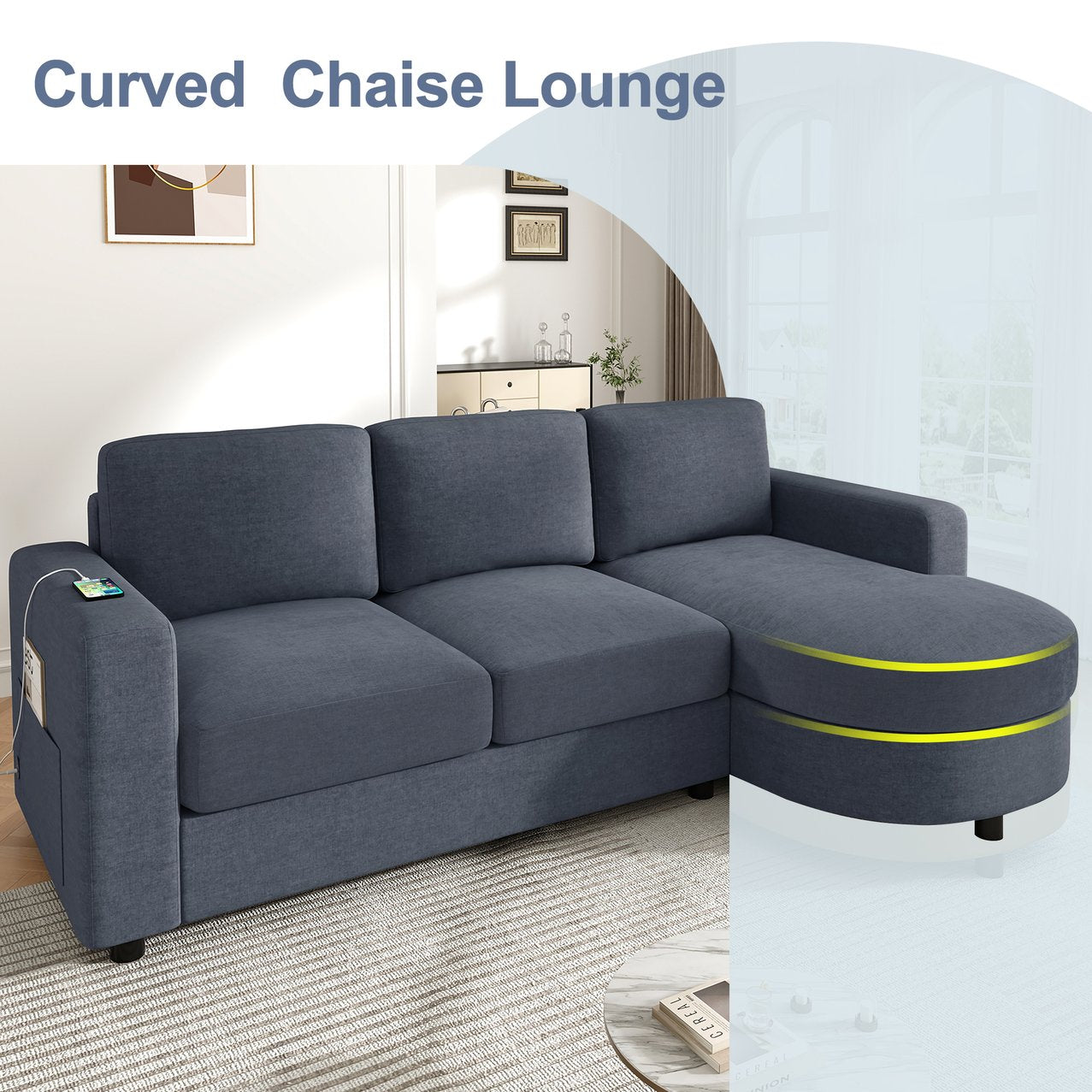 - Spacious L-Shaped Design with Curved Chaise - This modern sectional sofa measures 84.6" in length and 51.2" in depth, providing generous seating for family or guests. The right-side chaise lounge features a rounded curved design, creating a stylish focal point while offering extra space for stretching out, relaxing, or watching TV.