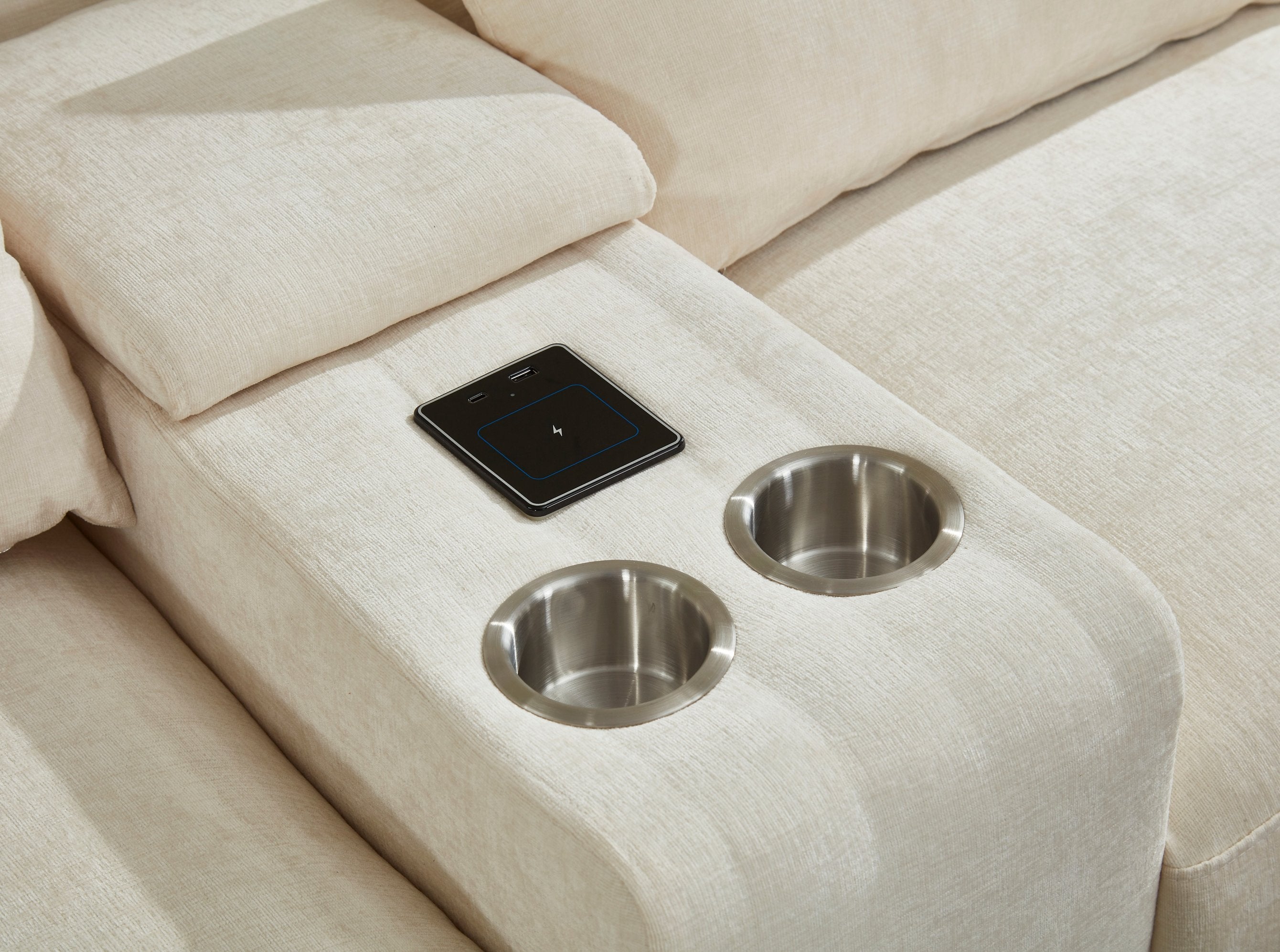 Transform your living space with this modern sectional designed for comfort, convenience, and lasting quality. Upholstered in soft beige microfiber, it combines plush seating with smart features—built-in USB charging, a reading light, and dual cup holders—so you can relax, entertain, or stay productive without leaving the sofa. The solid wood frame and thoughtful construction ensure everyday durability while the contemporary silhouette complements a wide range of interiors.